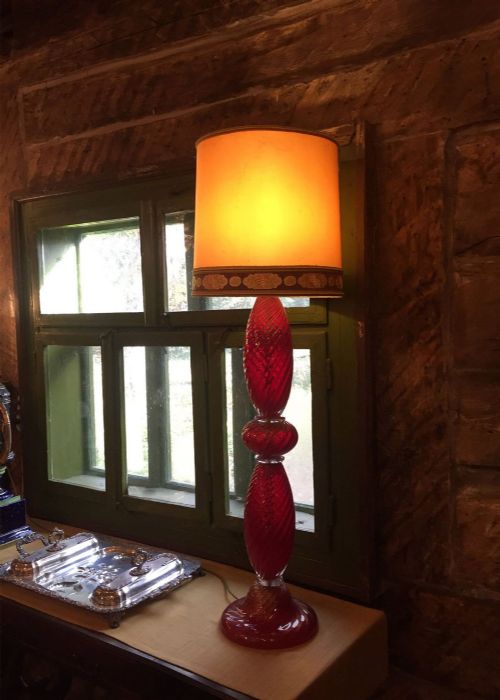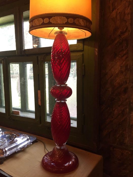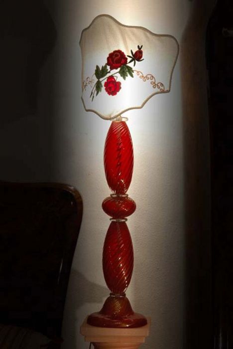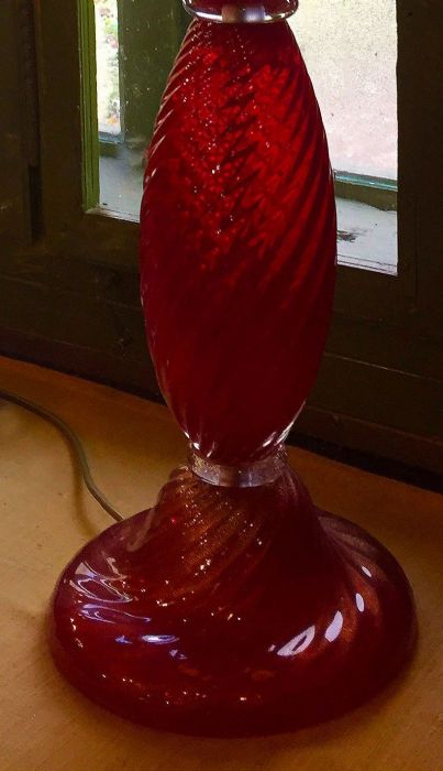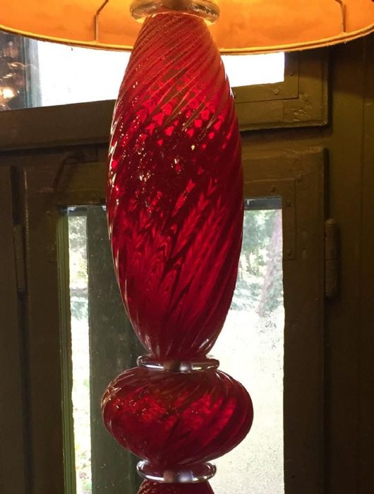 Piantana da appoggio con forme ad "oliva", lavorazione a torchon ( o meglio rigamenà/ rigadin ritorto), in vetro rosso Venezia e oro zecchino.