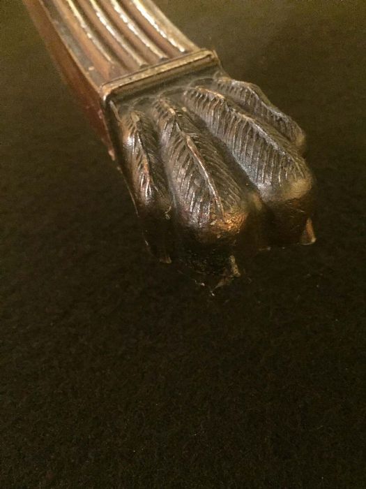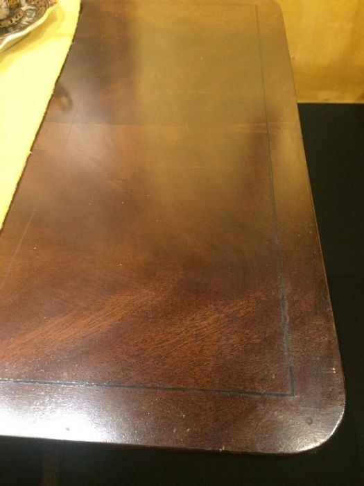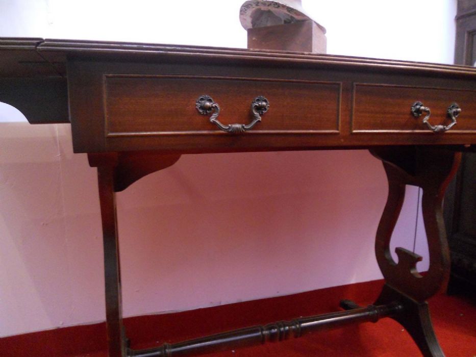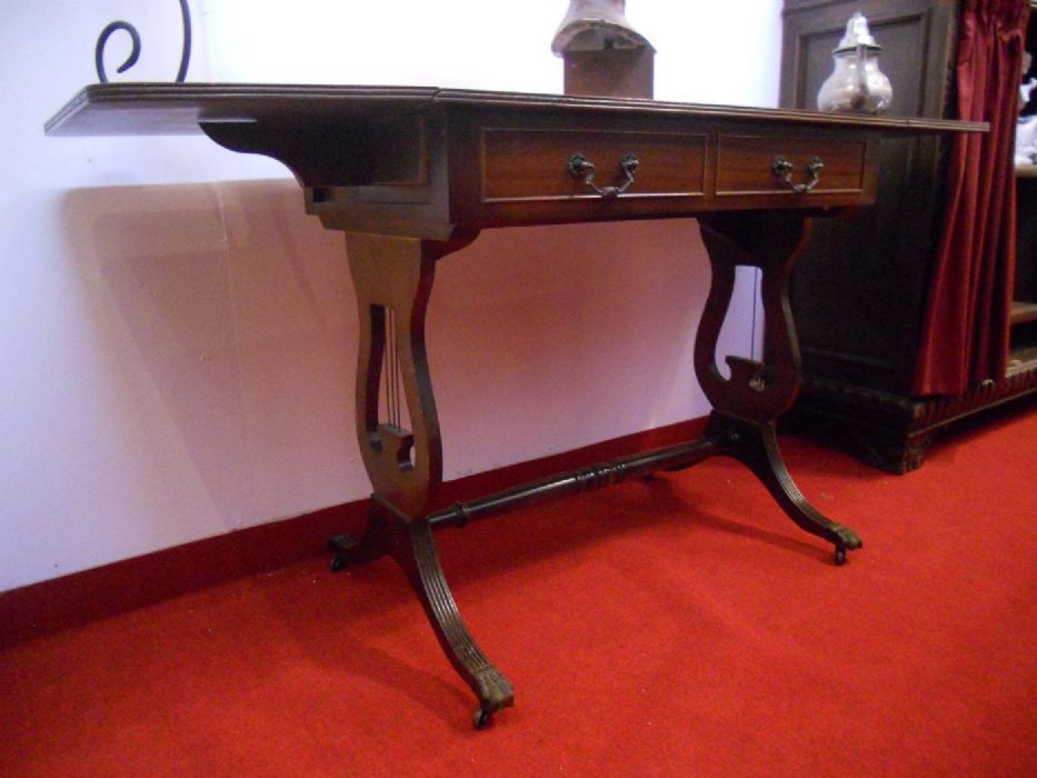 Elegante tavolo – scrittoio inglese Regency da centro in mogano. Il piano è sostenuto da due eleganti supporti a forma di lira che richiamano l’omonimo strumento musicale per la presenza di “corde” al loro interno. Le gambe sono tipicamente mosse e scanalate con la loro parte finale in ottone a forma di piede ferino a celare le piccole ruote. Nella fascia centrale del tavolo - scrivania vi sono quattro cassetti contrapposti (di cui una coppia è finta) con maniglie finemente lavorate in ottone. Il piano, filettato in ebano, presenta due bandelle laterali che possono essere abbassate singolarmente (appoggio al muro, per esempio) o entrambe.