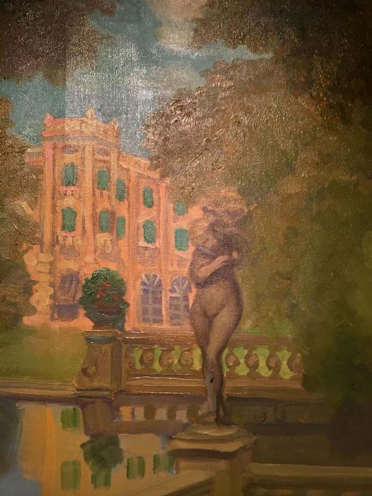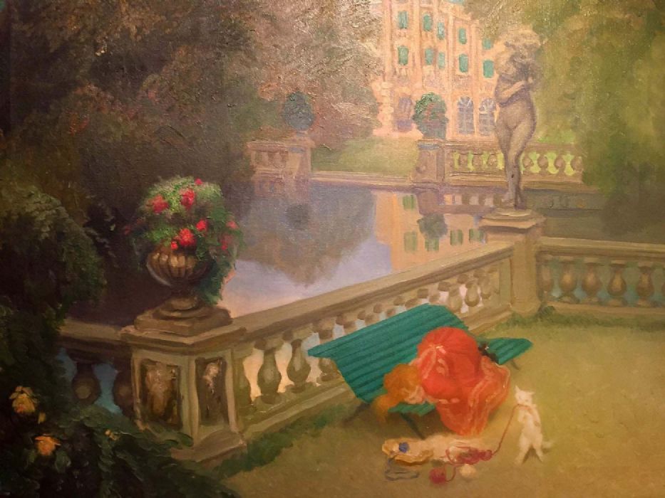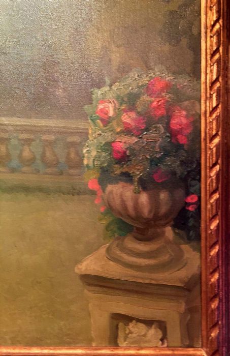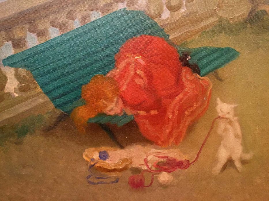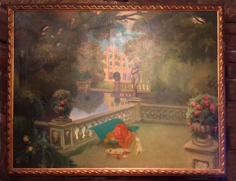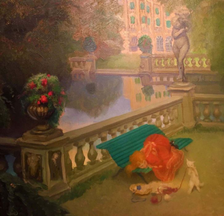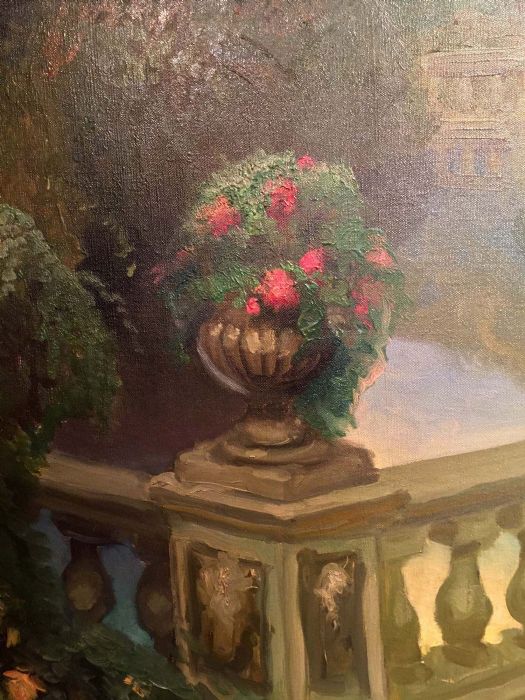 Delizioso dipinto olio su tela di ispirazione settecentesca ma con atmosfere ottocentesche. Fiori nei vasi, balaustre di stampo architettonico che circondano un laghetto, statua in pietra, macchie alberate, palazzi di fantasia, fanno da sfondo alla scena gentile di una bimba che gioca col suo gatto e il gomitolo di lana. La forma della panchina colloca il dipinto nella seconda metà dell’Ottocento.