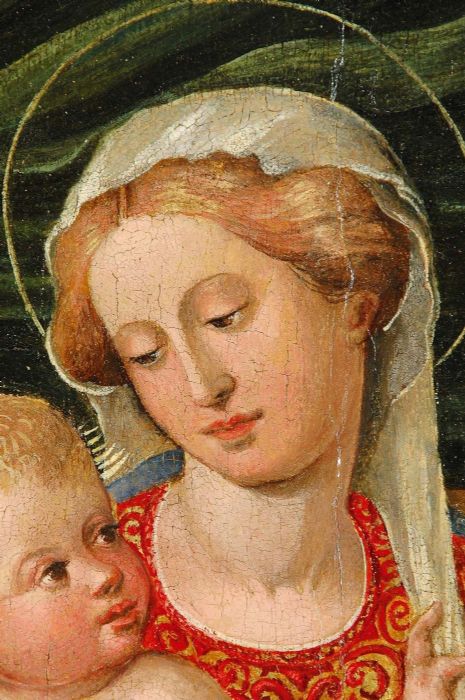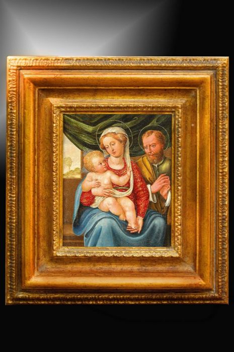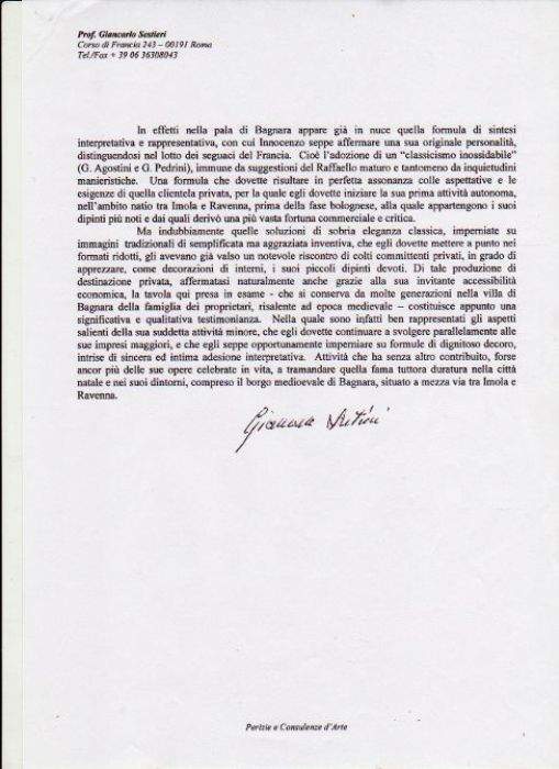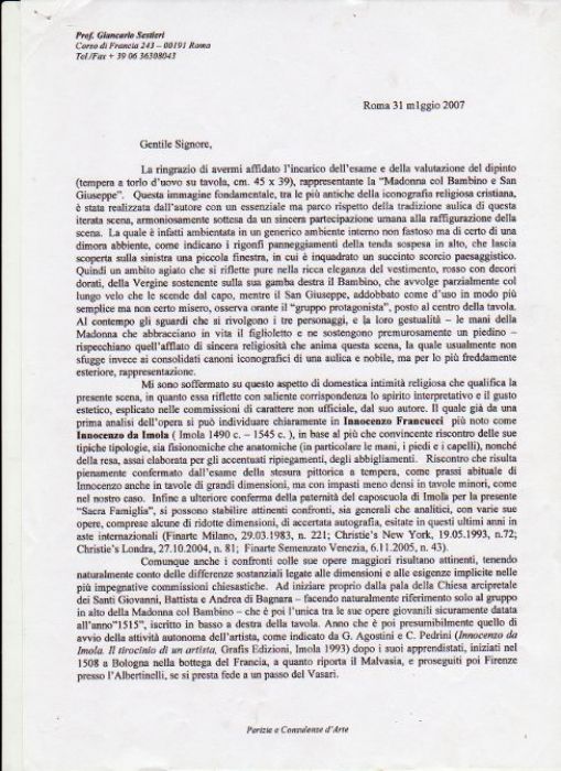 Innocenzo (di Pietro) Francucci da Imola, detto, più semplicemente, “Innocenzo da Imola” (Imola, c. 1484-1490 - Bologna, 1545/50), fu uno dei più significativi artisti rinascimentali del suo tempo e meritò l'appellativo, coniato per lui dal Vasari, di “Raffaello della Romagna” per il suo tratto classicamente armonioso e per lo stile pittorico illuminato che molto lo avvicinò ai modi compositivi del grande urbinate, Raffaello Sanzio. Figlio di un orefice, grazie ad un sussidio cittadino, fu apprendista a Bologna da Francesco Francia, pittore fra i più influenti dell'epoca, di cui diverrà il principale allievo. Nel 1515, dopo aver realizzato un’importante pala d’altare per la chiesa di Bagnara di Romagna, aprì la sua bottega a Imola e a questo periodo risale il dipinto “La Madonna in trono col Bambino, San Cassiano e San Pier Grisologo in atto di adorazione”, conservato nella Pinacoteca comunale, che si dice realizzato dal pittore come segno di gratitudine verso la municipalità imolese per il sussidio elargitogli: infatti il quadro raffigura i santi protettori di Imola, con San Cassiano che regge fra le mani la città. Nel 1517 Innocenzo lasciò Imola alla volta di Bologna, segnando con questo il passaggio a commesse di maggior prestigio e alla fama. Le grandi pale d'altare e i numerosi dipinti di devozione privata, fra cui questa deliziosa interpretazione del tema della “SACRA FAMIGLIA” (databile al 1515), ovvero la “MADONNA COL BAMBINO E SAN GIUSEPPE”, magistralmente expertizzata dal Prof. Giancarlo Sestieri di Roma (vd. expertise pubblicata qui di seguito) e facente parte del catalogo delle opere riconosciute autografe del maestro, lo consacrano pittore dei maggiori ordini religiosi e delle famiglie bolognesi e romagnole più importanti.