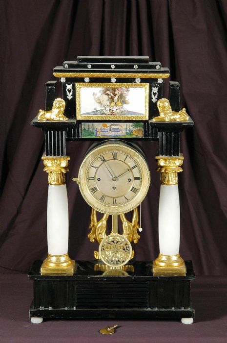 Tipico orologio viennese a portico in legno ebanizzato, capitelli e leoni con doratura a foglia.