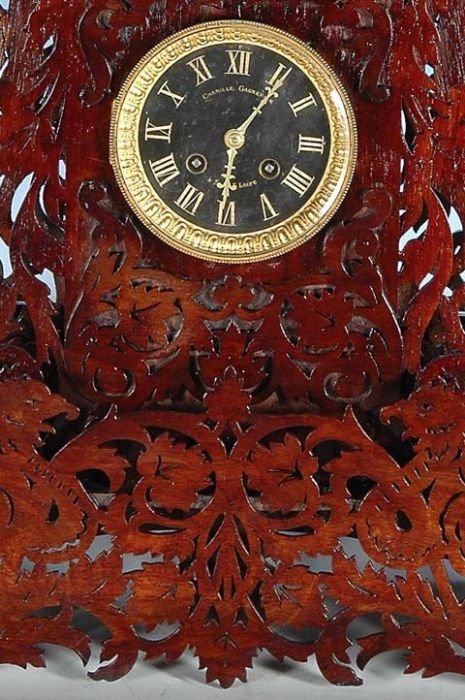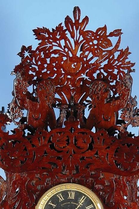 Importante e rarissimo orologio da tavolo in legno di pino traforato con incastri speculari, sagome di grifoni alati e sirene con trofeo "a ramages" fioriti. Movimento francese a pendola lunga, batte le ore e le mezze ore su campana. Ne esistono solamente 2 esemplari, il gemello si trova presso il Museo-bottega della tarsìa lignea a Sorrento.