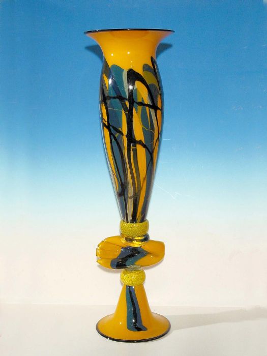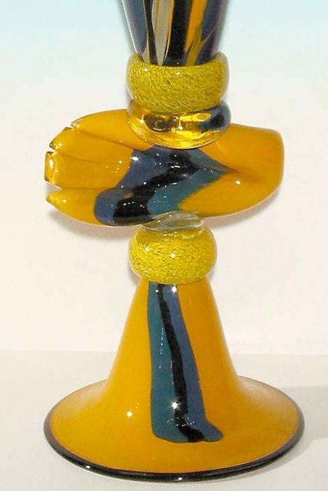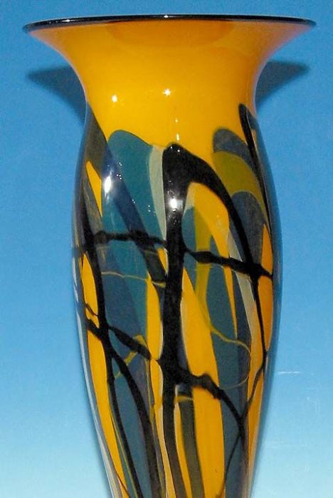 Importante vaso monumentale colore di fondo giallo con policromie. Lavorazione a doppio incalmo e filo in intrusione. Il maestro Mentoyu, di origini rumene, ha appreso l'arte del vetro a Murano ed in quest'opera si ispira ai modi compositivi di Andy Warhol.