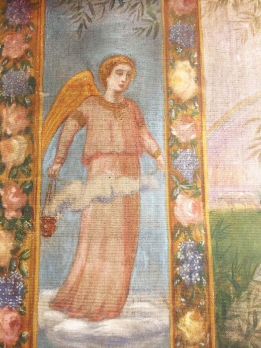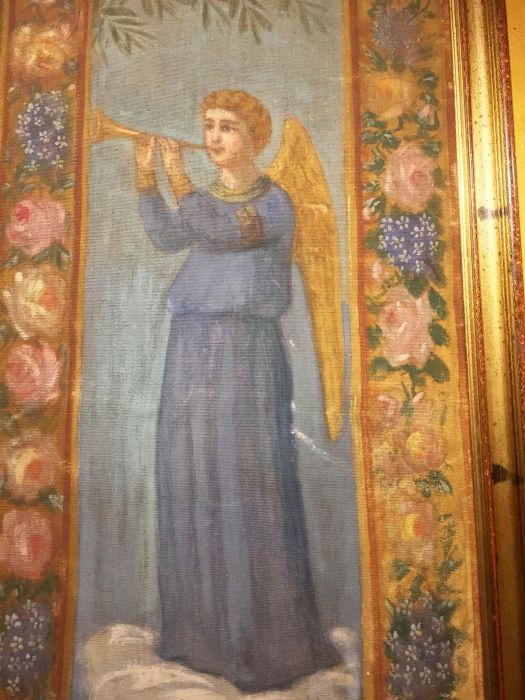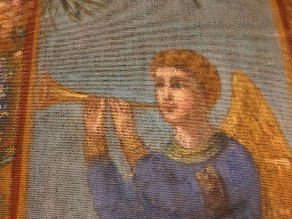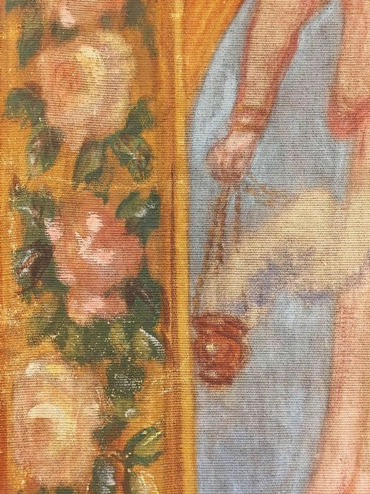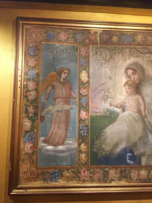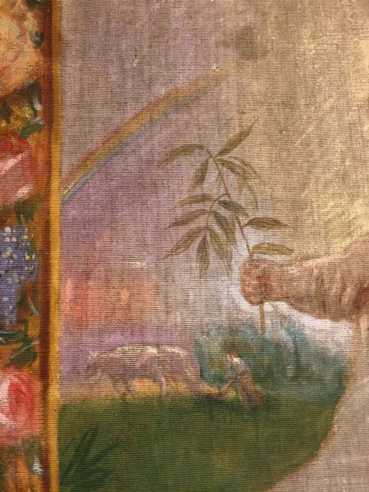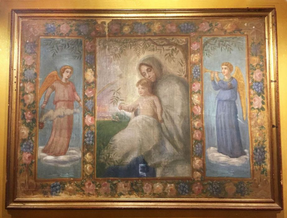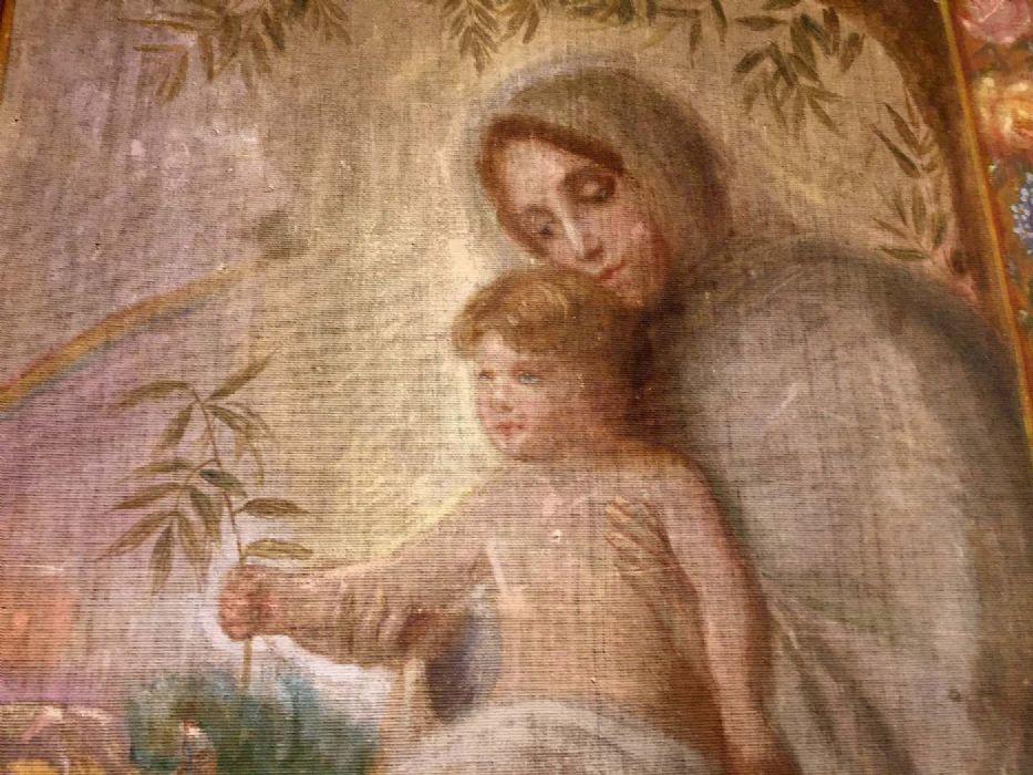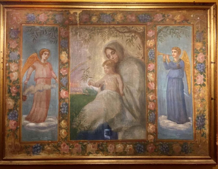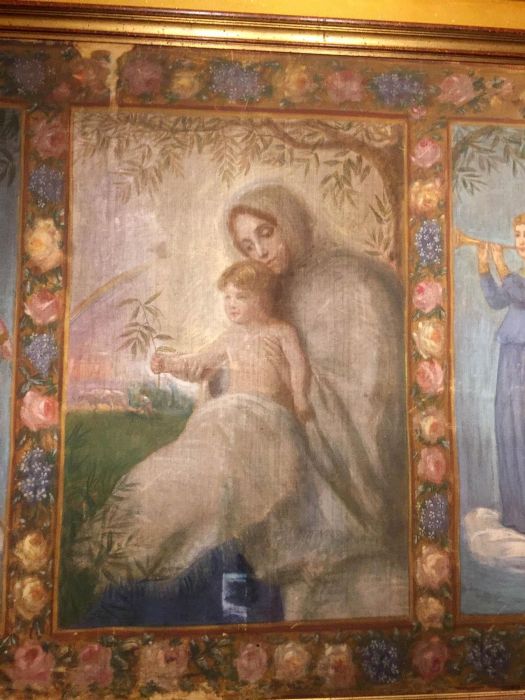Delicata rappresentazione devozionale di fantasia, su grande formato, di una scena allegorica sacra divisa in tre riquadri. In quello centrale si trova la Madonna col Bambino, entrambi di bella mano, con aspetto domestico molto terreno e dolcemente devozionale. Sia Lei che il Bambino, che porta un ramo di ulivo nella mano, non presentano l'aureola per accentuarne la Terrenità sottolineata da tratti bellissimi (di una "Mamma col suo Bimbo") che li caratterizzano. La scena gentile è inquadrata con semplicità e "voluta ingenuità" da uno sfondo bucolico nel quale troviamo, in basso a sinistra, un contadino, sovrastato da un arcobaleno, che lavora la terra coi buoi dopo la pioggia. Tralci di ulivo (simbolo di Pace Universale) contornano superiormente l'immagine mariana. Nel riquadro di sinistra (destra per chi guarda) vediamo un Angelo musicante che annuncia la lieta novella della Nascita di Gesù (probabilmente l'artista intende raffigurare, sempre in modo devozionale, l'Arcangelo Gabriele che suona la tromba per annunciare il giubilo dei credenti). Nel riquadro di destra (sinistra per chi guarda) ecco un'altro Arcangelo (lo indicano le ali) che sparge incenso "sull'Altare del Cielo volato in Terra" (....."Poi venne un altro angelo e si fermò all’altare, reggendo un incensiere d’oro. Gli furono dati molti profumi perché li offrisse insieme con le preghiere di tutti i santi bruciandoli sull’altare d’oro, posto davanti al trono. E dalla mano dell’angelo il fumo degli aromi salì davanti a Dio, insieme con le preghiere dei santi”..... (Apocalisse 8,1-4). I tre riquadri del dipinto sono circondati ed inframezzati da racemi fioriti di rose e gelsomini, che accentuano l'aspetto "gentile e amorevole" di questa bella e musicale "fantasia sacra".