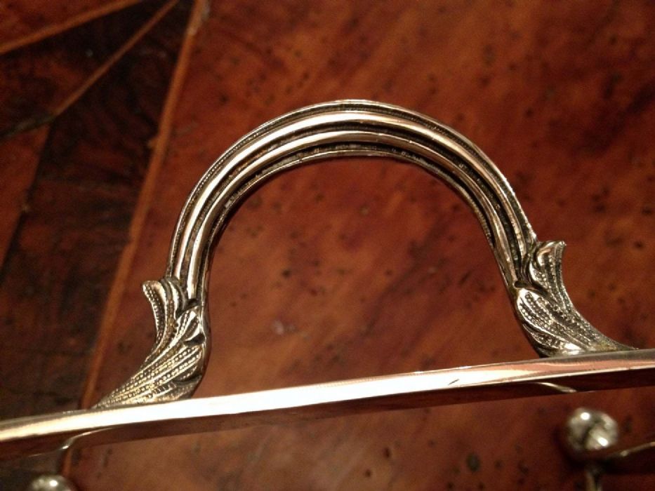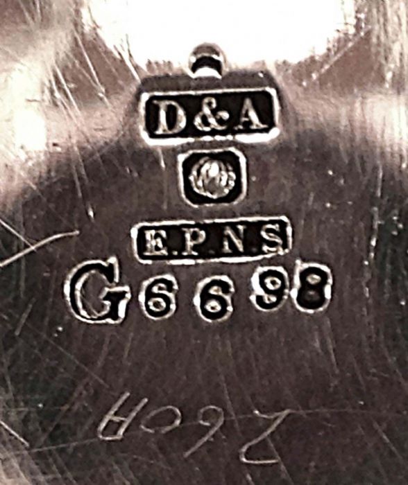 La punzonatura riporta le iniziali D&A al di sotto un globo e la dicitura E.P.N.S (Electroplated nickel silver). seguito da una lettera e numeri G6698. Si nota anche un’incisione rovesciata, forse fatta successivamente: 26 O A.
