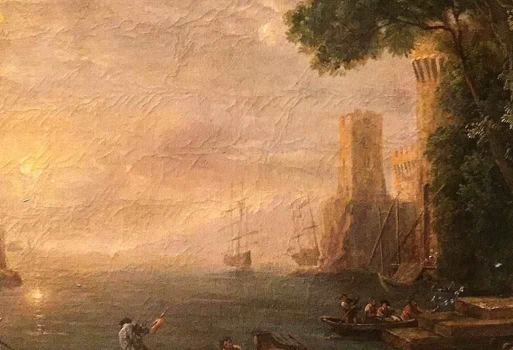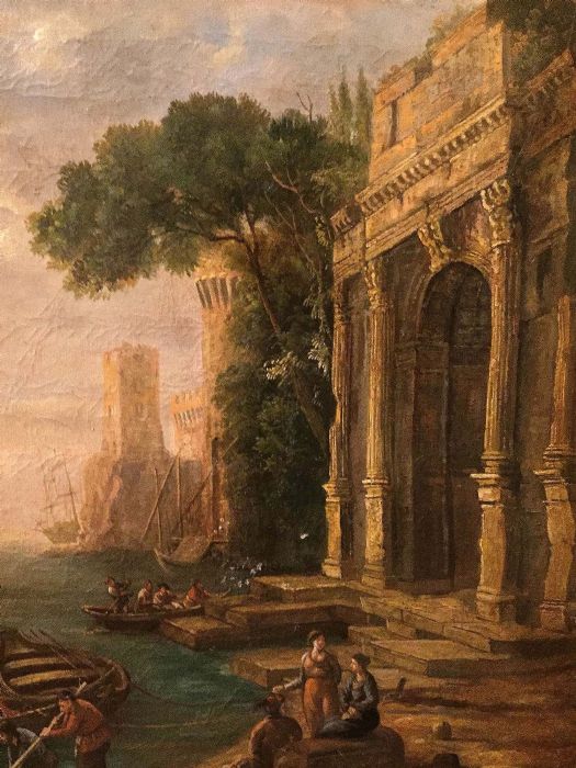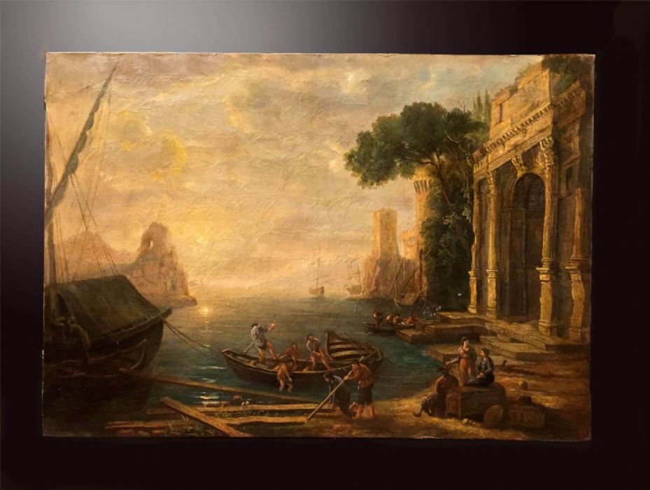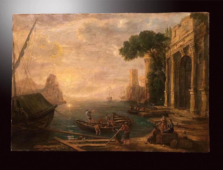 PESCATORI SULLA RIVA NEL PAESAGGIO MARINO ITALIANO CON ARCHITETTURE - olio su tela del XIX sec.