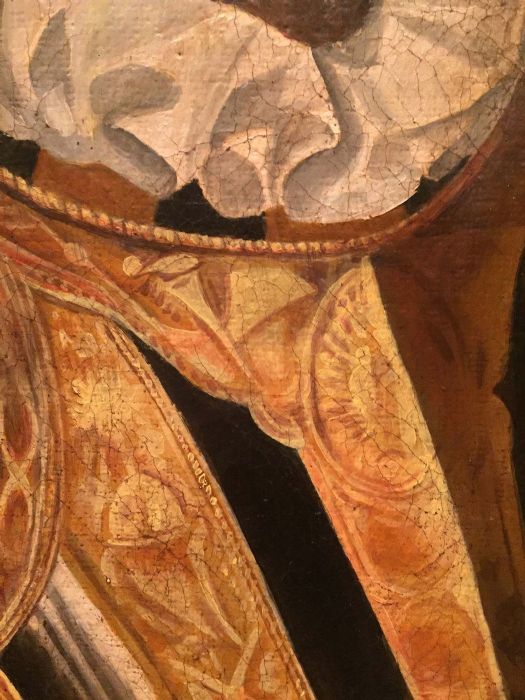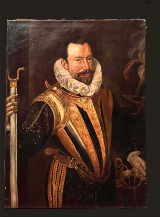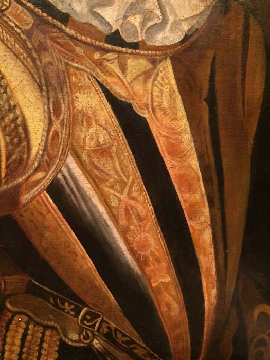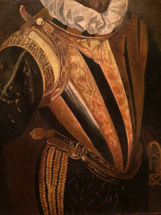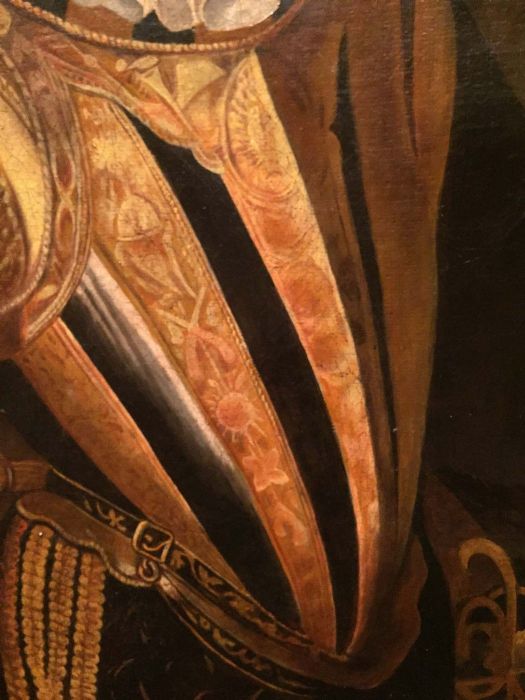 Il ritratto così caratterizzato mostra con dovizia di particolari le caratteristiche del vestiario di un cavaliere del tempo, molto probabilmente di origini nobili per la bella gorgiera, un collaretto di solito di lino increspato, che porta attorno al collo, una elegante corazza con incisioni molto fini e di ottima fattura. Non dimentichiamo che la scuola milanese per le incisioni sulle armature era molto nota al tempo presso le corti europee ed anche in precedenza . Infatti nella decorazione si possono notare armi da fuoco incrociate fra loro, elmi, armi bianche inserite in uno scudo “da parata” (tipico delle casate nobiliari), fregi ed emblemi.