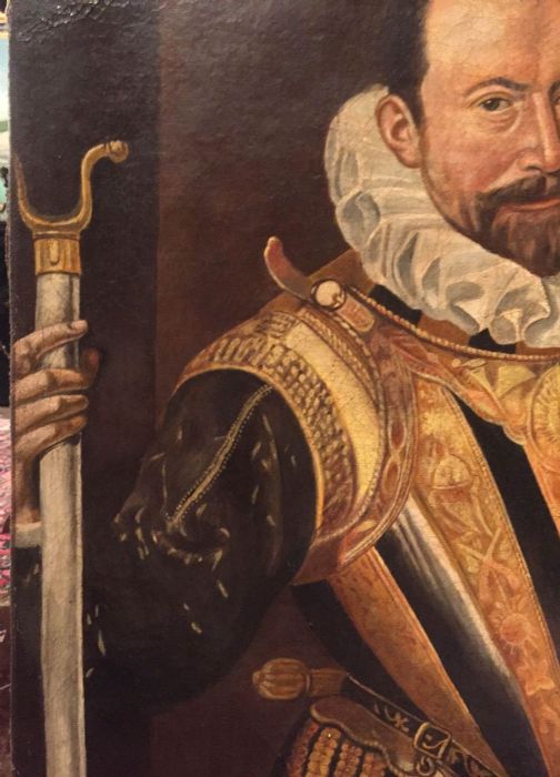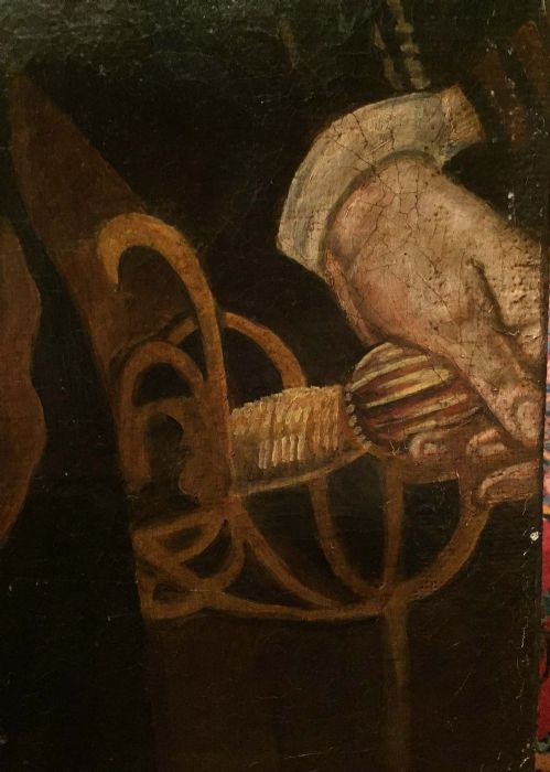 Mentre la mano sinistra tiene l’elegante “manico” della spada, la sinistra regge uno strumento tipico dei fucilieri: “la forcella d’appoggio al terreno” per armi da fuoco di dimensioni ragguardevoli. Completano il suo abbigliamento pantaloni riccamente ricamati e con applicazioni molto elaborate. Dietro al ritratto si intravvede l’elmo piumato.