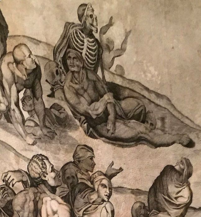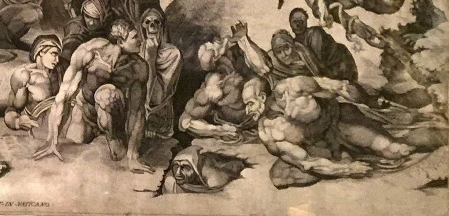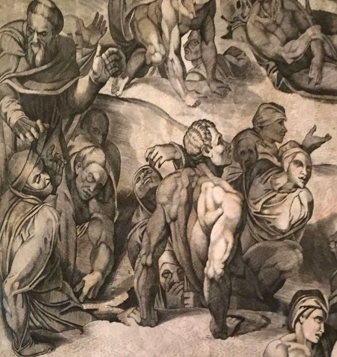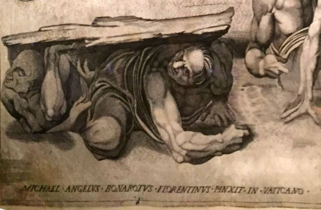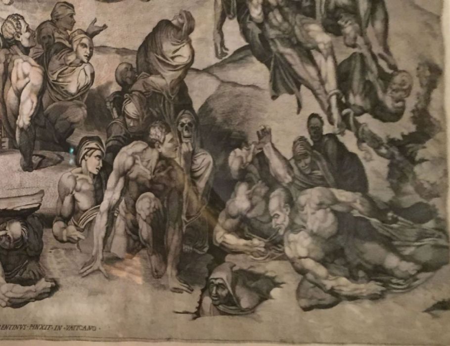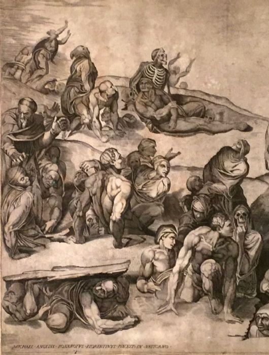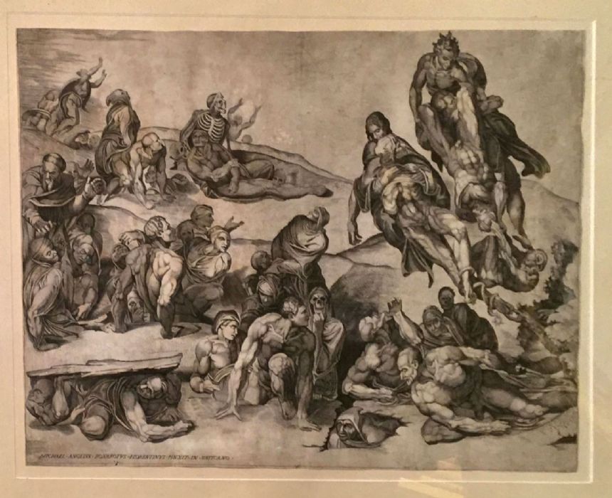 La tavola qui proposta, databile al 1562, costituisce uno dei nove fogli incisi a bulino con cui il Beatrizet realizzò graficamente il Giudizio Universale di Michelangelo. E’ possibile che lo stesso Michelangelo abbia visto ed approvato la realizzazione grafica del Beatricetto che, a questo punto, può essere considerato un suo allievo e seguace.