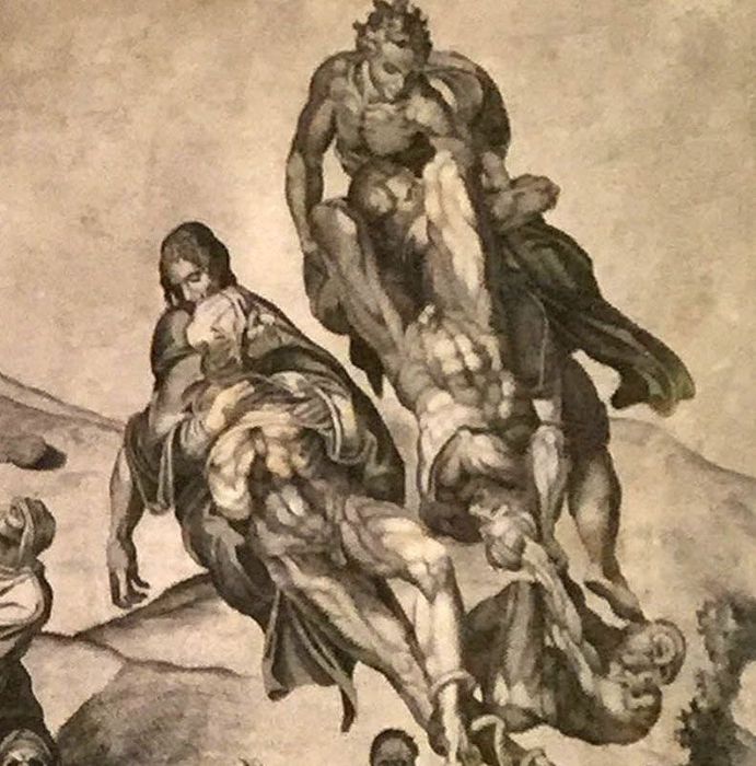Secondo diversi studiosi l’importanza delle opere di Beatrizet (poi chiamato in Italia Beatricetto) sta nel fatto che diverse di esse sono tratte da scene realizzate pittoricamente da alcuni dei più grandi artisti del suo tempo, fra cui appunto Michelangelo. La maestria del Beatricetto sta quindi nel saper riportare graficamente in una tavola di piccole dimensioni le scene di grandi pitture come questa che è riferita al Giudizio Universale di Michelangelo da questi realizzato, qualche decennio prima, sulla parete verticale della Cappella Sistina.