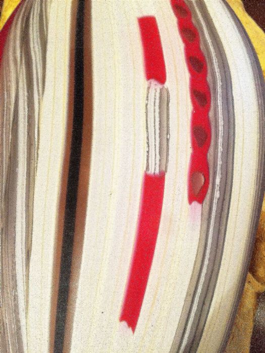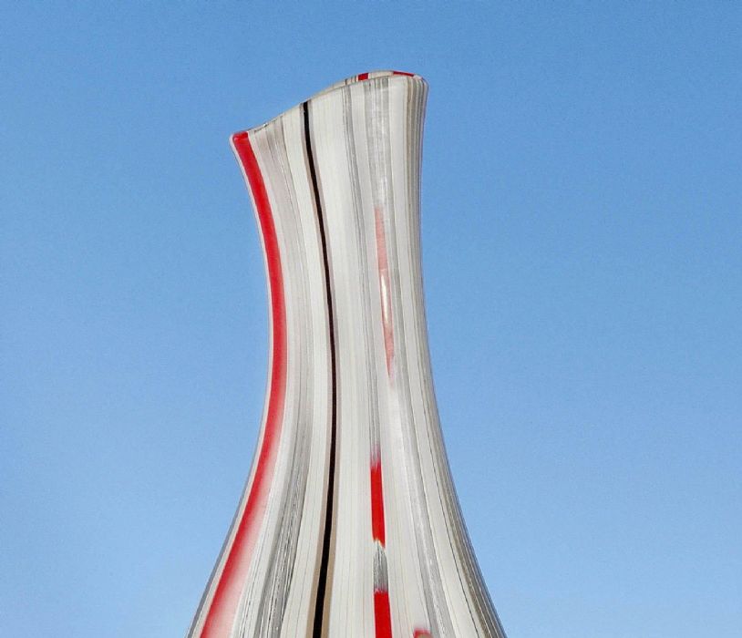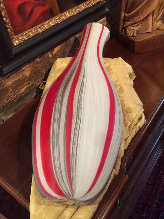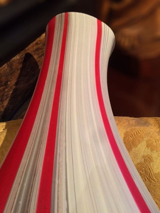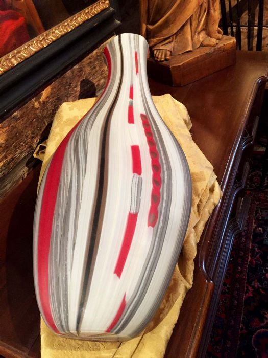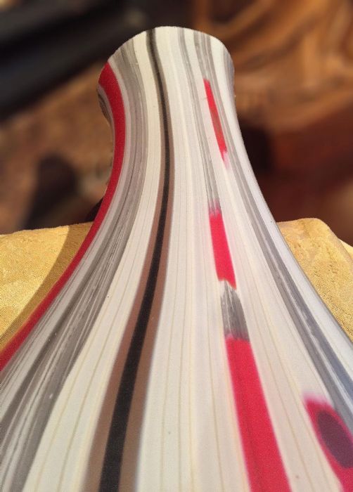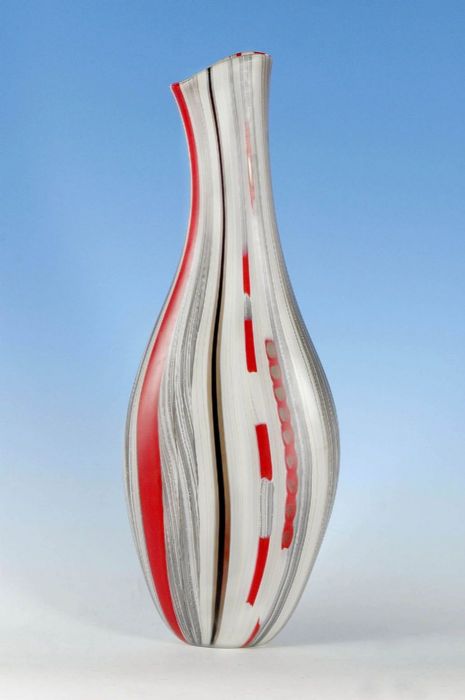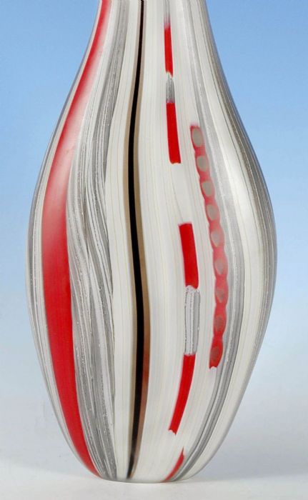 Grande vaso lavorato "a canne" con estrosi accostamenti di bianco, rosso, grigio, marrone e nero.