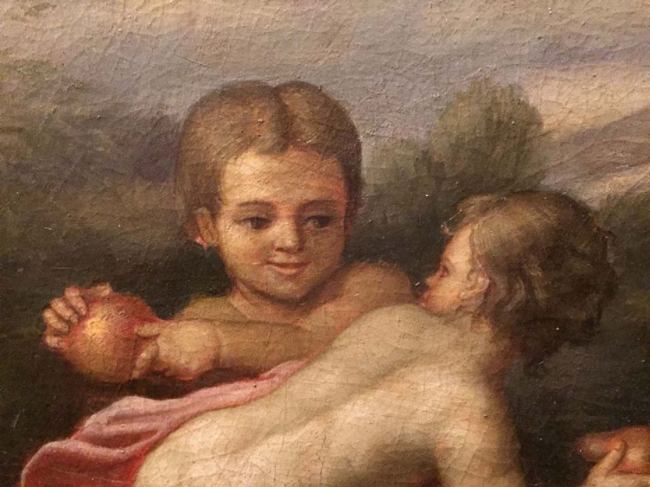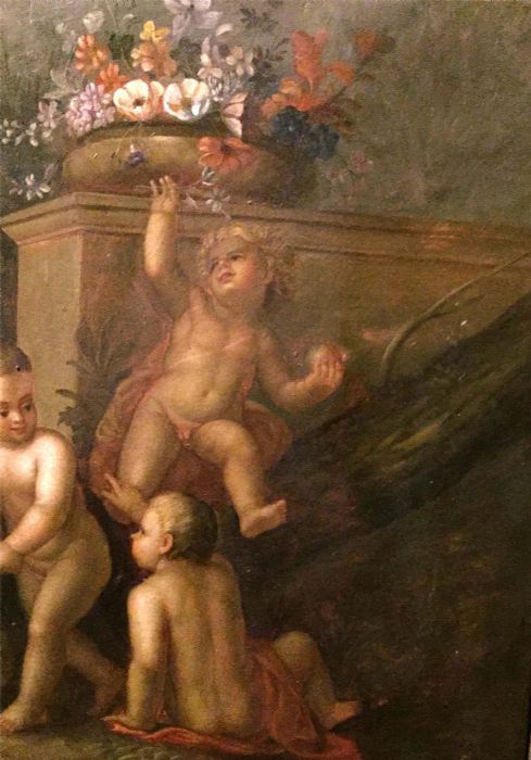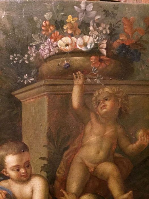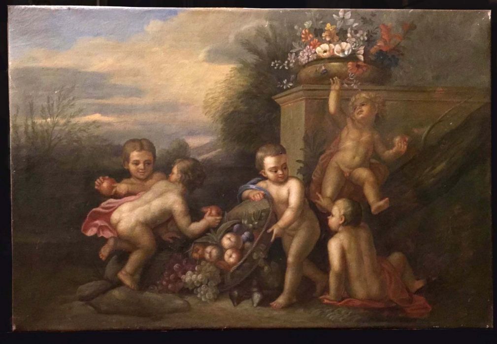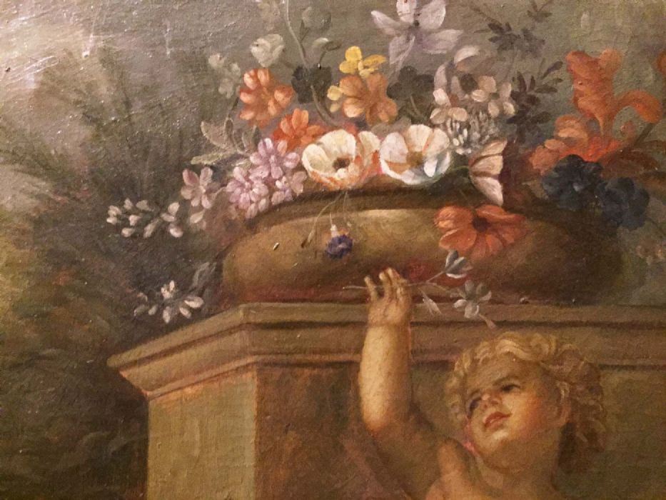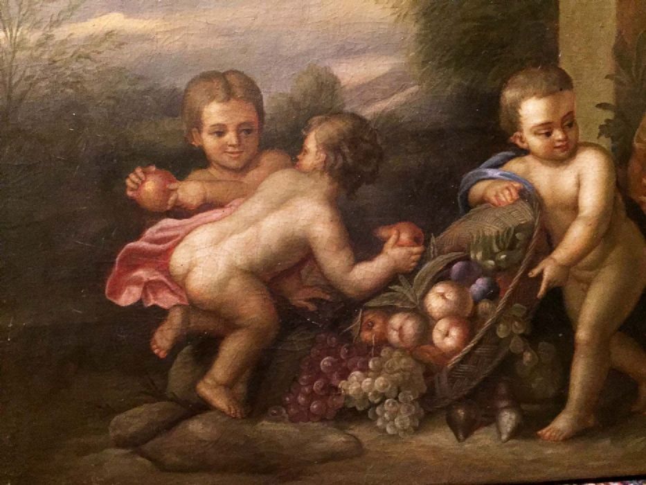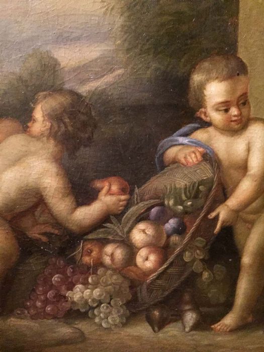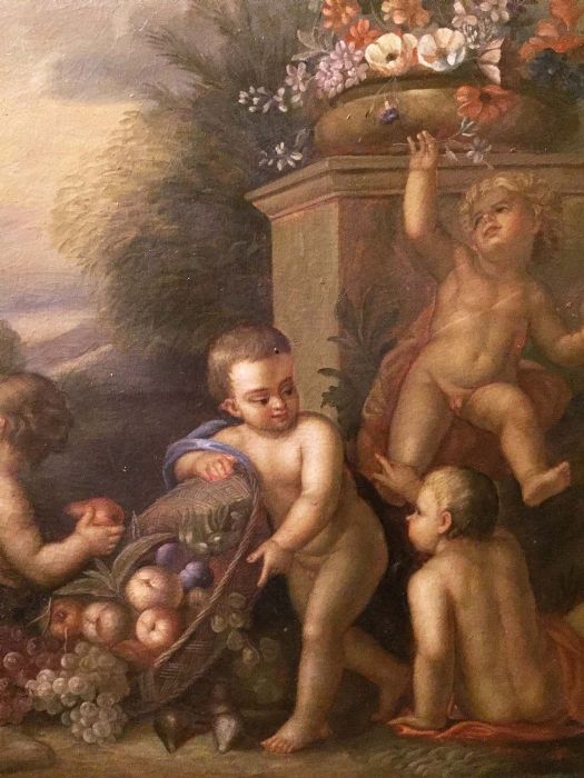 Un incantevole dipinto tratto da un quadro di Jacob De Wit. Una simpatica allegoria di bambini, o putt,i che giocano spensierati con frutta e fiori in un giardino idealizzato.
