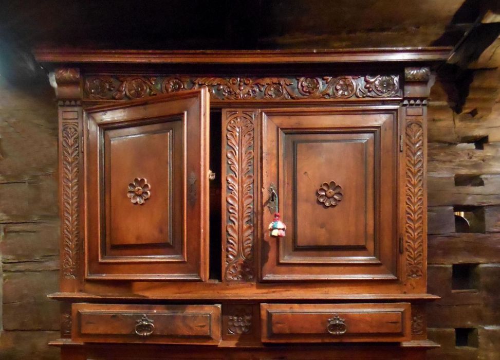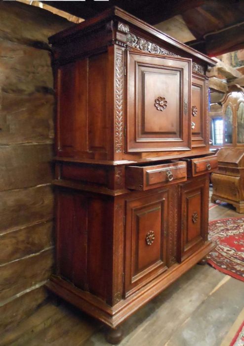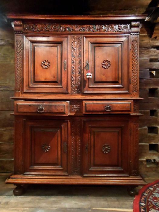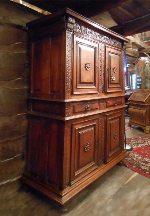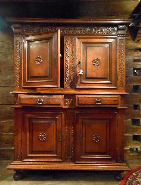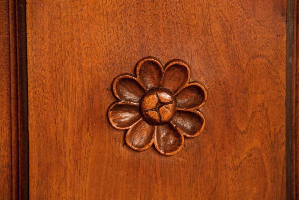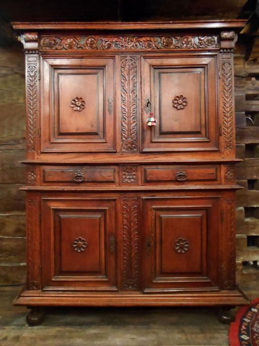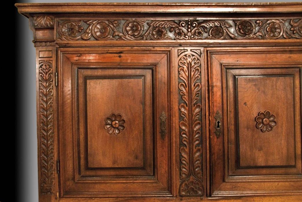 Mobile molto elegante, interamente in noce massiccio, a 4 ante con 2 cassetti centrali. Decorazioni floreali a rilievo evidenziate dal fondo a china. Ferrature originali dell'epoca. Il decoro a forma di margherita al centro di ogni anta rappresenta il segno inconfondibile dell'ebanisteria ligure di quel periodo. I piedi a cipolla risentono dell'influsso francese.