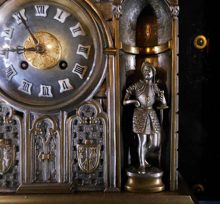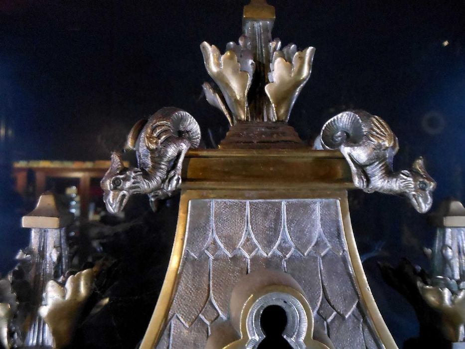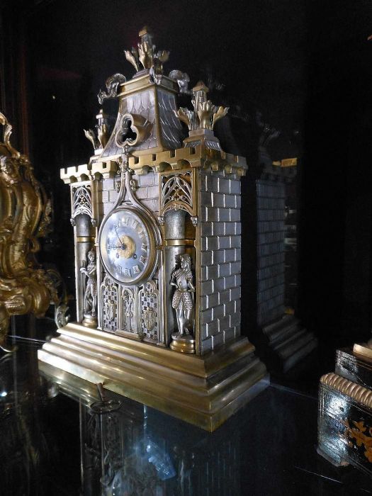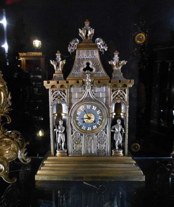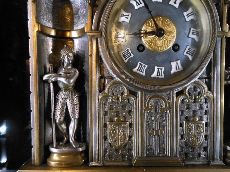 Questo orologio a pendolo vuole rappresentare una fortezza – castello del tipico gotico francese. La sua struttura si presenta con gli armigeri sul fronte a protezione dell’antica porta. Le pietre ben marcate danno un senso di forza e robustezza alla struttura stessa. Il tetto con lastre di ardesia sormontato dalle quattro torri a difesa della struttura. La cosa più incredibile sono i quattro draghi posti sulla cimasa dell’orologio “che sputano fuoco e fiamme” come cannoni belligeranti. Per la sua composizione, le forme, la struttura, le proporzioni si può pensare a un disegno del grande architetto francese Viollet le Duc ( 1814 -1879), colui che restaurò Carcassonne. Opera incredibile di grande fascino, interamente in bronzo (a mecca). Macchina tipo Parigi con scappamento ad ancora senza rinculo a pendolo lungo. Batte le ore e le mezze ore su campana. Perfettamente funzionante.