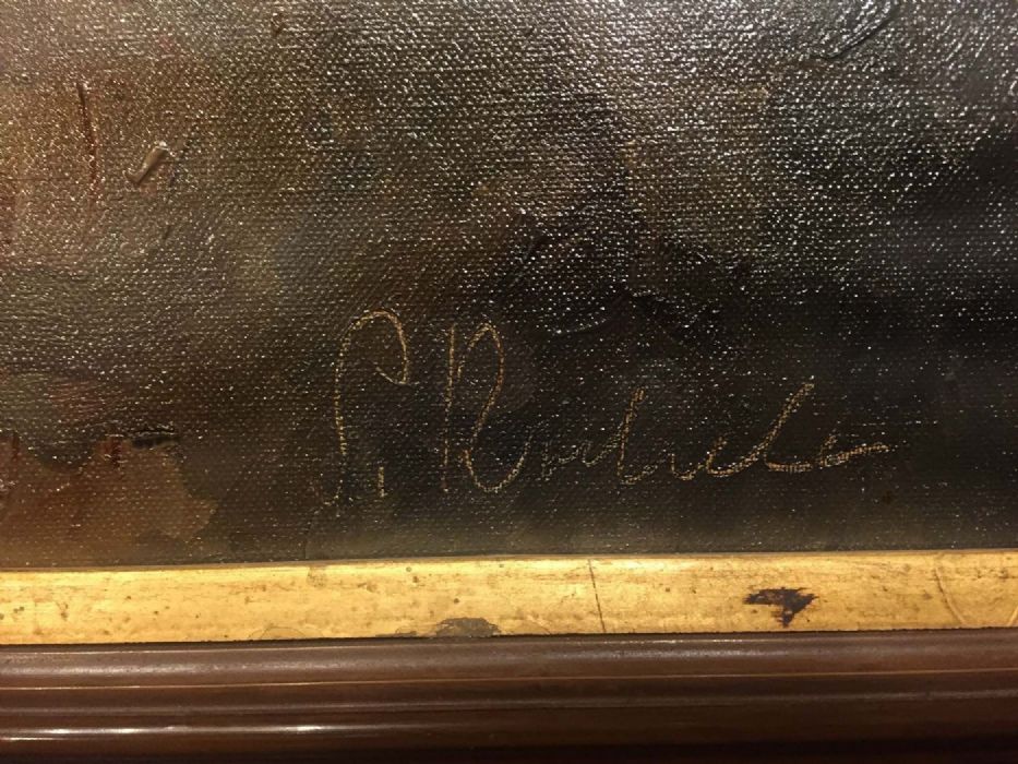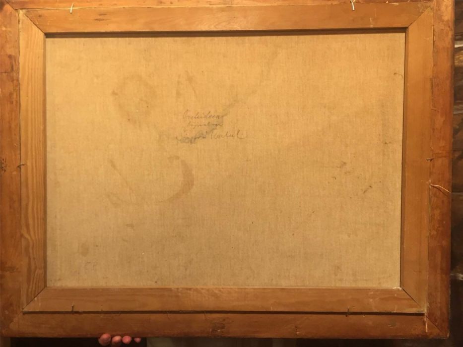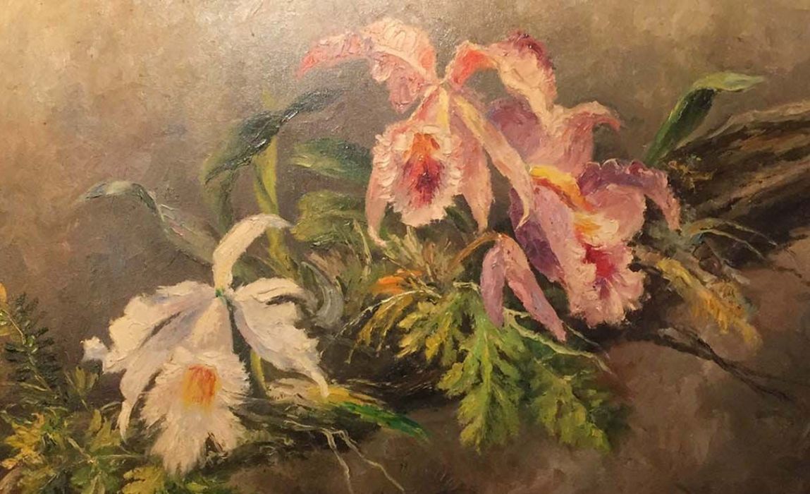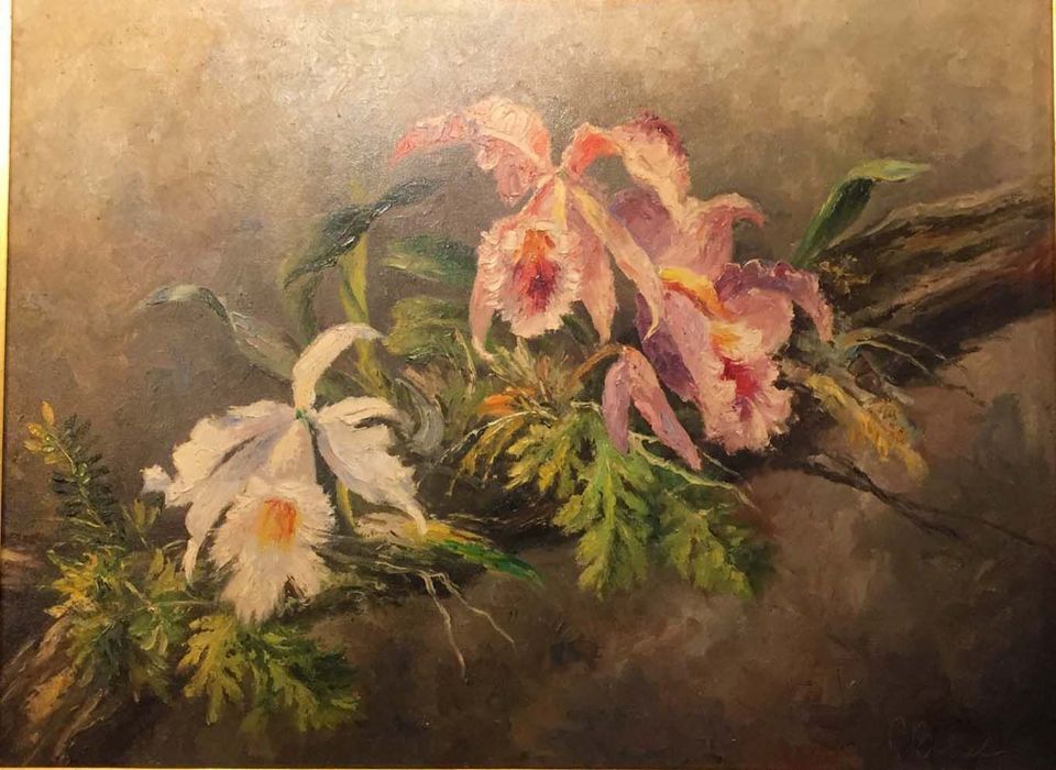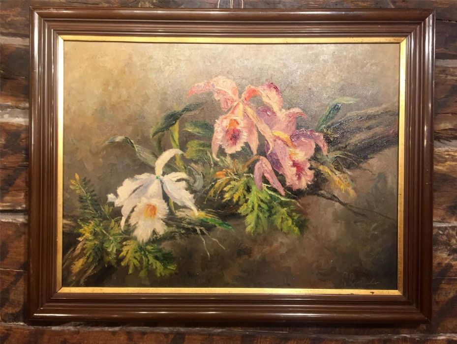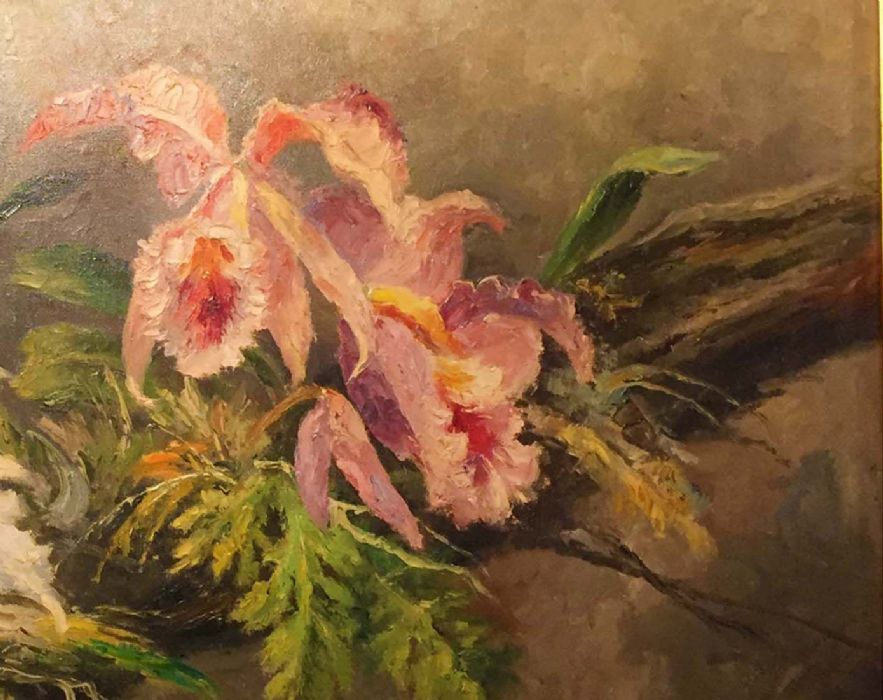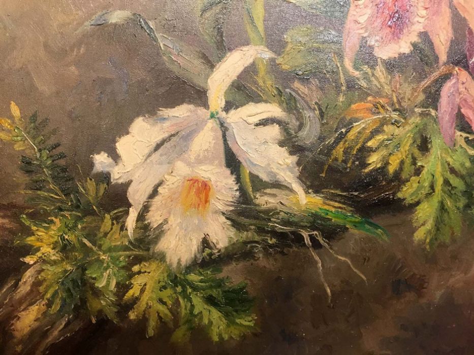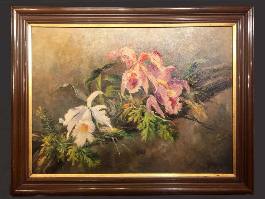 Intensa, elegante e vivida rappresentazione di un ramo di orchidee. Il pittore (che si firma in basso a destra) riesce a cogliere in modo mirabile il momento stesso in cui questi fiori straordinari e particolari si mostrano all’apice della fioritura. Come noto le orchidee sono “epifite” ovvero nascono sui rami degli alberi. La rarità del dipinto, oltre alla maestria dell’artista, sta proprio in questo particolare di aver raffigurato questi fiori entrati nella leggenda non recisi e ben sistemati all’interno di un vaso ma in natura nel pieno della vita. Nessuna “natura morta” dunque, neppure “natura sospesa” (il concetto di “still life” o “stlleben” è qui superato dal verismo), soltanto l’idea di riprendere realisticamente dal vero il momento più esaltante della fioritura.
