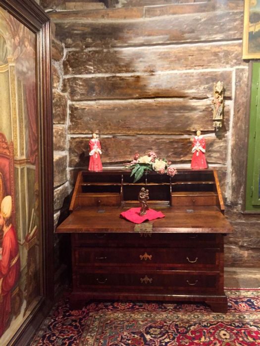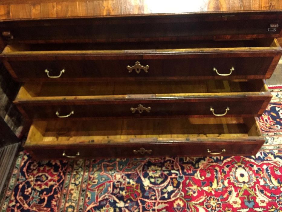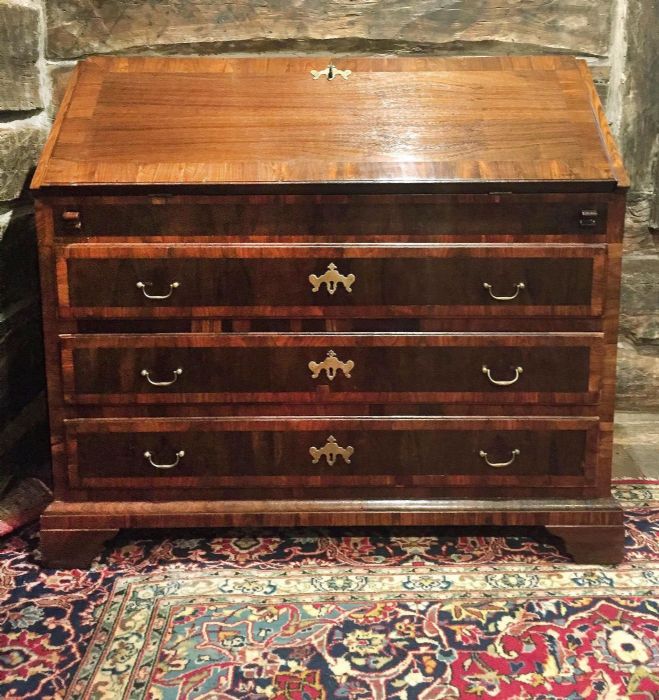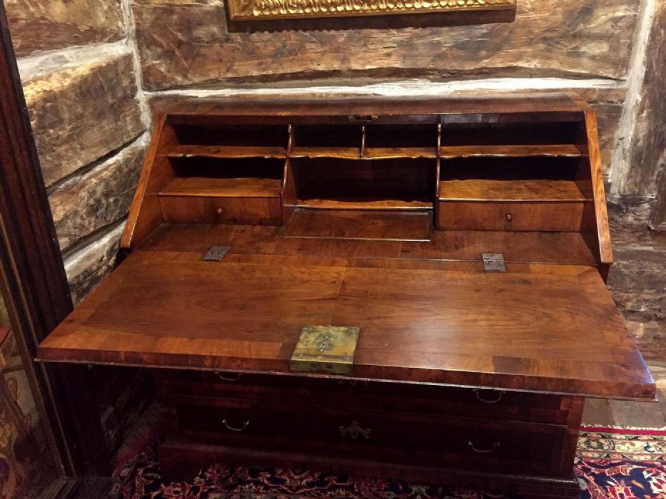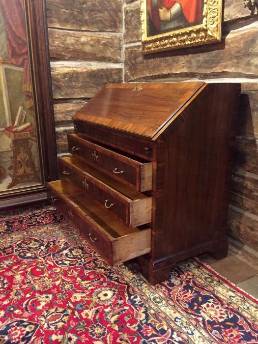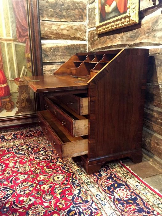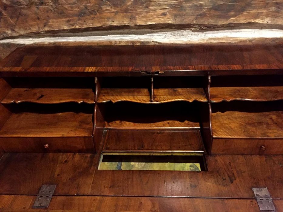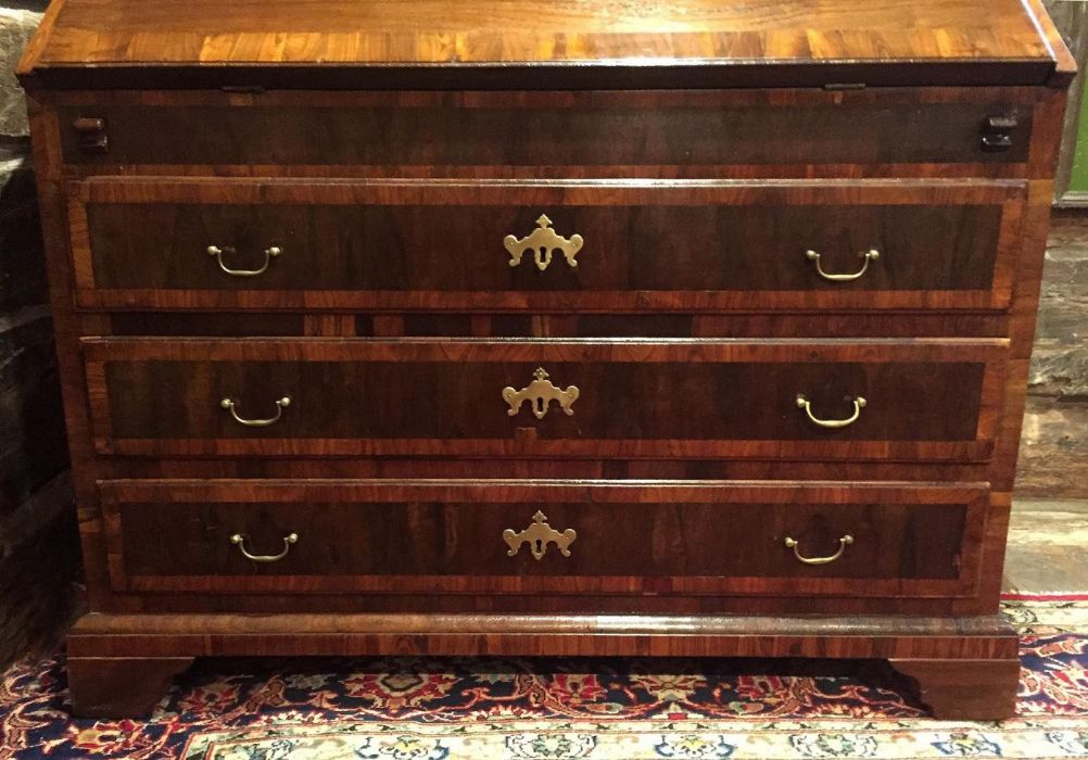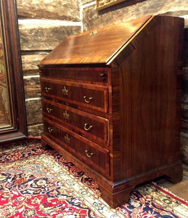 Elegante bureau a ribalta in noce e radica di noce di inizio Ottocento e di area veneta. Sul fronte presenta tre cassetti, riquadrati ed incorniciati da disegni in radica di noce. Raffinate toppe delle chiavi in bronzo dorato a forma di corona alata. Maniglie e serrature originali, funzionanti e con presenza di chiave. La ribalta si apre a calatoia tradizionale celando al suo interno sette piccoli vani a giorno di diverse dimensioni e due cassetti. Al centro del ripiano interno un’anta a scorrimento nasconde una segreta. Piedi a mensola.