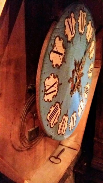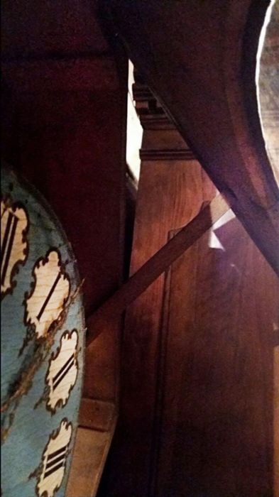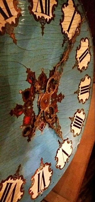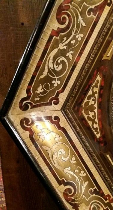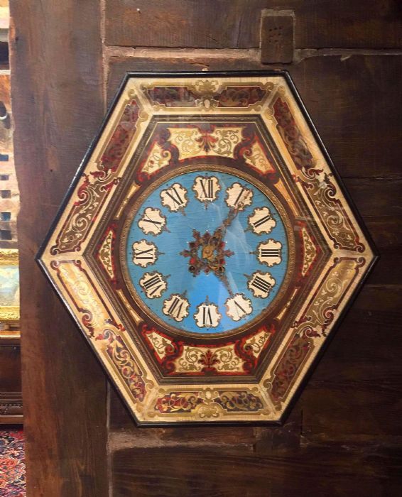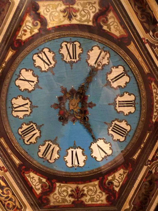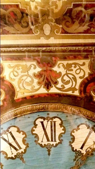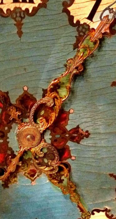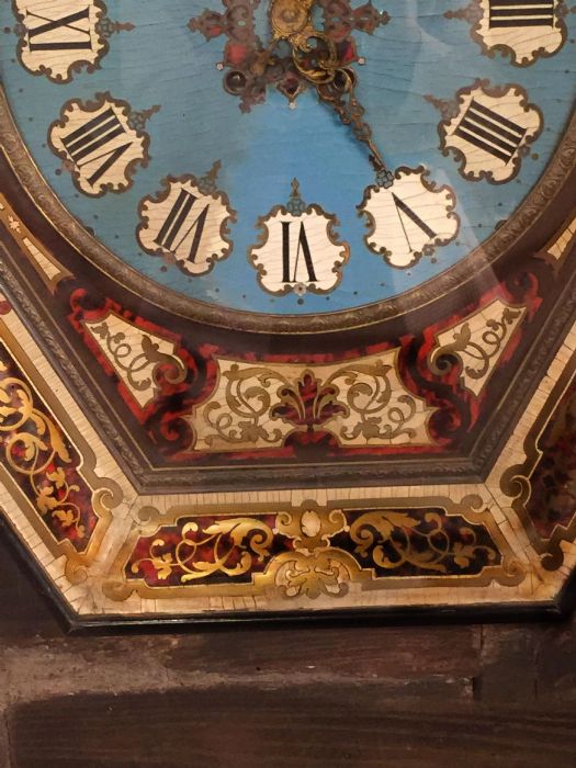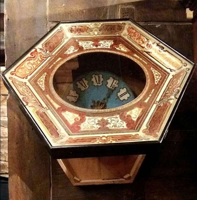 La cassa dell’orologio è di forma esagonale impreziosita da applicazioni in rame dorato sapientemente innestato con piccole parti in ottone e “legno di tartaruga” predisposto a racemi in intarsio su legno. Un vero e proprio trionfo del savoir-faire degno della migliore ebanisteria per l’orologeria del tempo. Sofisticato nella ricercatezza espressa tramite l’utilizzo e l’accostamento di più materiali eterogenei fra loro. La parte esterna è ebanizzata e racchiude il vetro originale che dà l’accesso, alzandosi, al quadrante in legno dipinto in azzurro, dove i numeri romani sono disegnati all’ interno di un piccolo scudo con fondo bianco e racchiusi da una cornice dipinta in oro a volute. Le bellissime lancette in ottone sono lavorate tipo “rococò”. Al centro del quadrante decori e racemi si susseguono celando i due fori della carica e della suoneria dell’orologio.