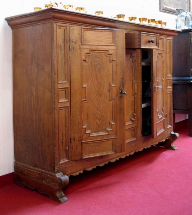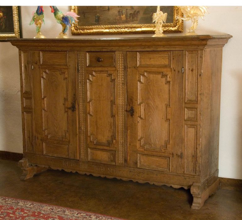Signorile credenza interamente in rovere massiccio, intagliata e scolpita con elegante “grambialina” alla base.