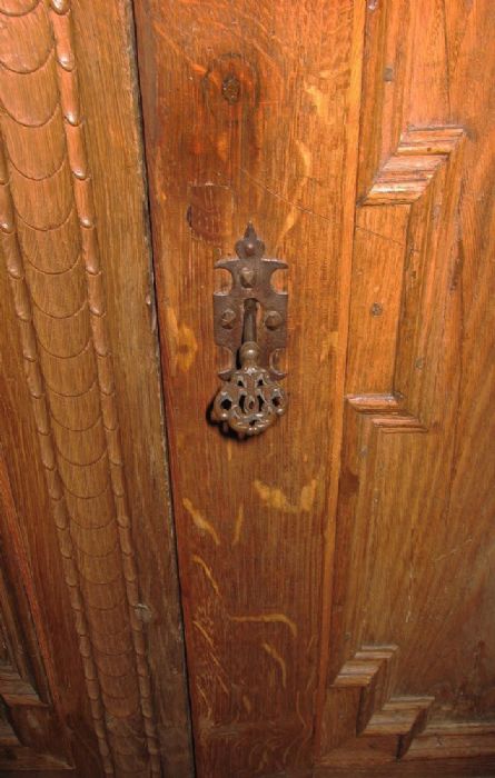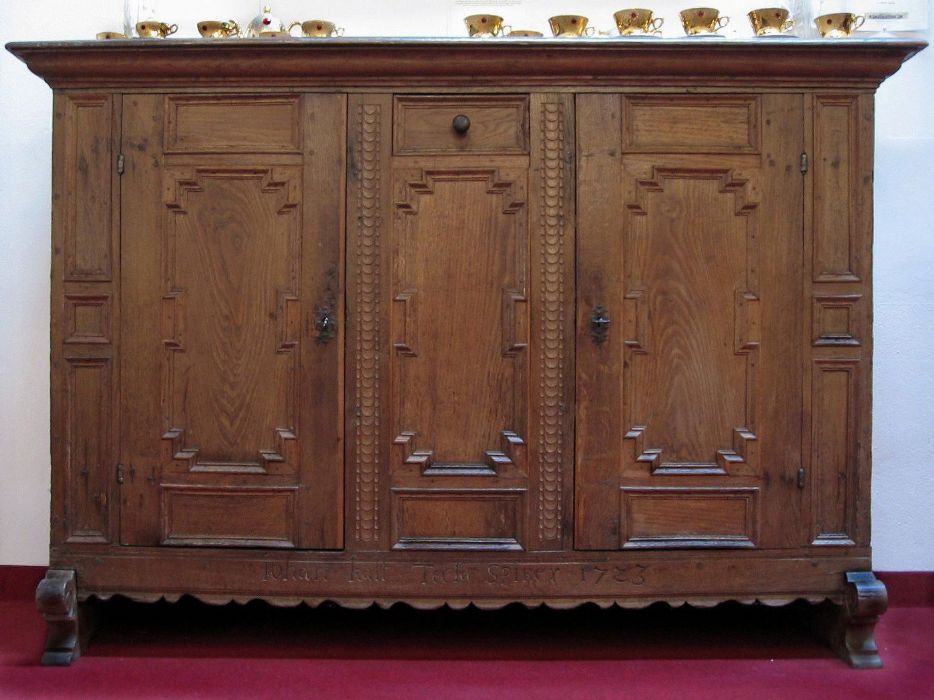Presenta un piccolo ma profondo cassetto centrale e due ante frontali con riquadri geometrici. All'interno vi sono due ripiani e due piccoli cassetti porta - posate aggiunti in epoca più tarda.