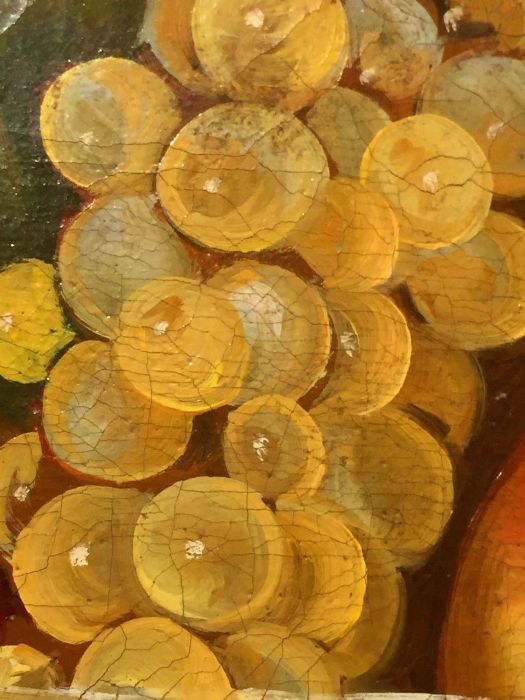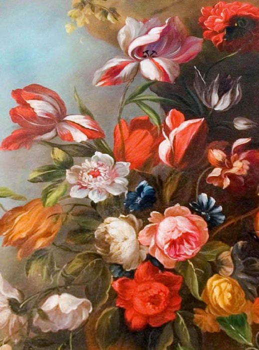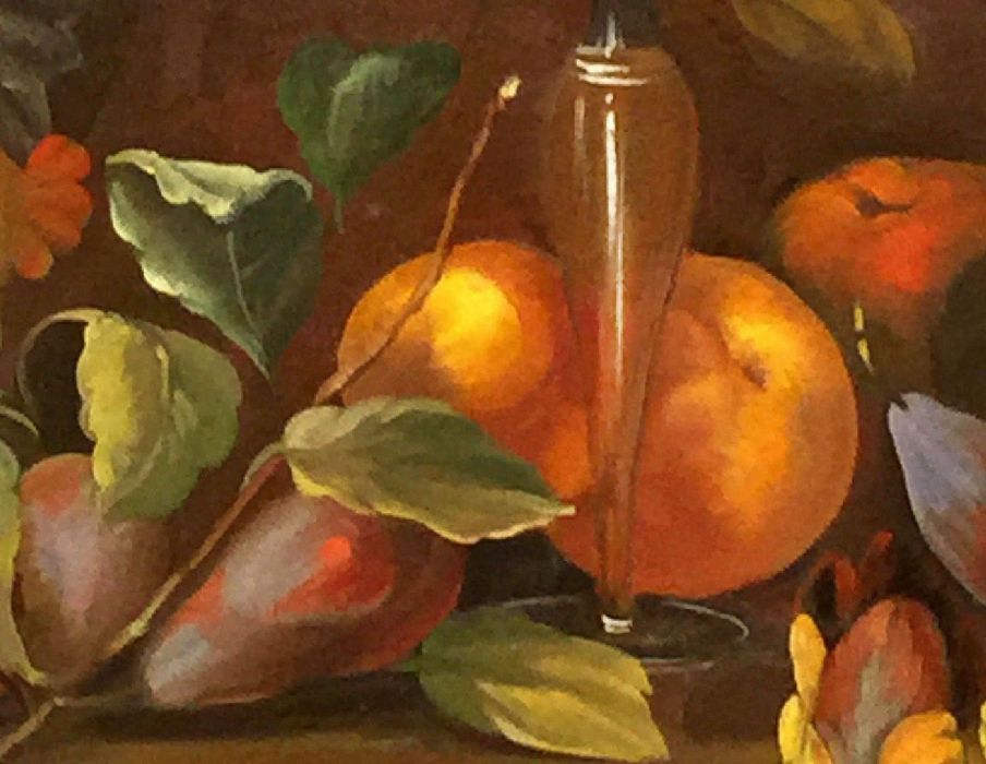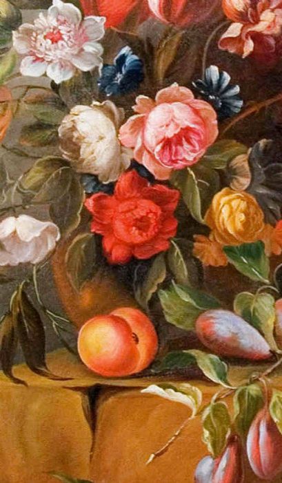 Se notiamo vi sono fiori e frutta che non appartengono allo stesso periodo dell’anno. Quindi nel dipingere egli ha dovuto attendere e perciò “sospendere” di dipingere nell’attesa che alcuni fiori sbocciassero e che la frutta venisse raccolta. In entrambi i quadri vi sono fiori primaverili come i tulipani, narcisi, peonie, primule, dalie (quasi estive) e rose. La frutta estiva rappresentata dalle pesche che vengono anche accolte entro una fruttiera di vetro finissimo assieme a tralci e grappoli di uva, frutta autunnale, come le mele, le pere e le prugne. Nell’atro quadro le pesche si intravvedono all’interno di un piatto in ceramica bianca con decorazioni blu, sempre in compagnia di un grappolo d’uva nera e tralco di vite e, adagiate sulla roccia, mele e pere.