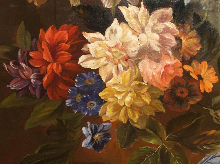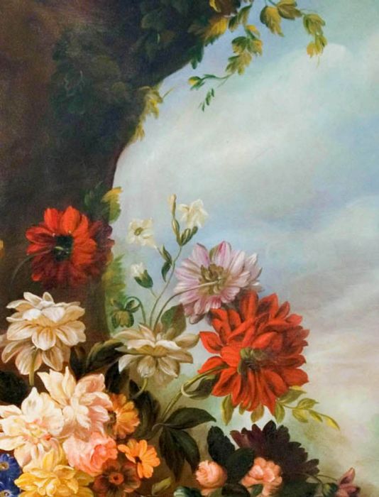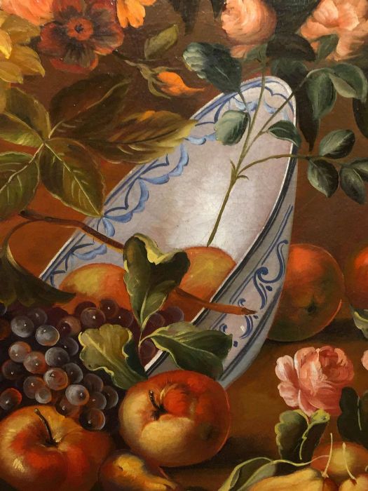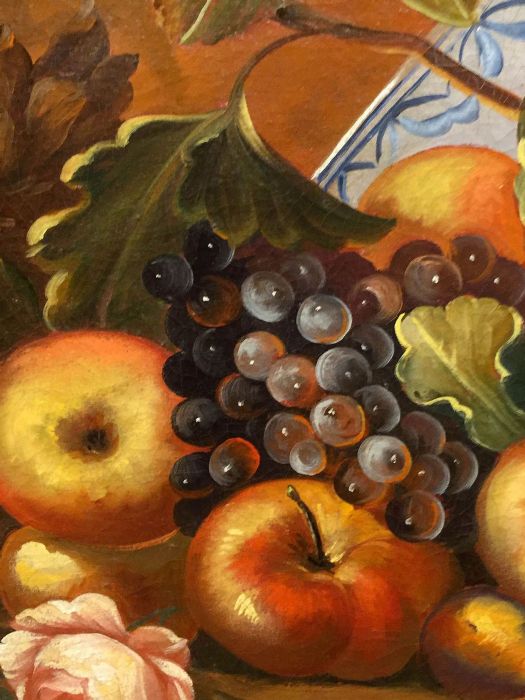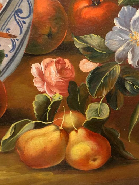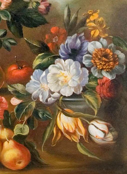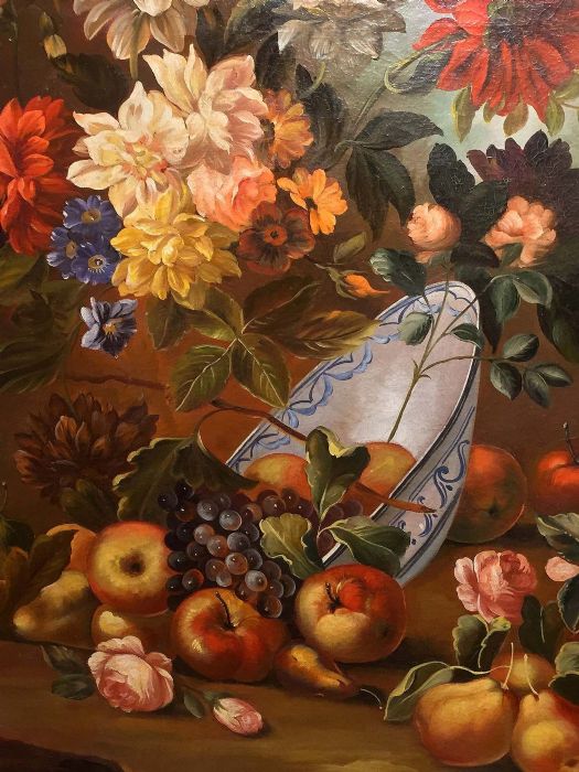 Se notiamo vi sono fiori e frutta che non appartengono allo stesso periodo dell’anno. Quindi nel dipingere egli ha dovuto attendere e perciò “sospendere” di dipingere nell’attesa che alcuni fiori sbocciassero e che la frutta venisse raccolta. In entrambi i quadri vi sono fiori primaverili come i tulipani, narcisi, peonie, primule, dalie (quasi estive) e rose. La frutta estiva rappresentata dalle pesche che vengono anche accolte entro una fruttiera di vetro finissimo assieme a tralci e grappoli di uva, frutta autunnale, come le mele, le pere e le prugne. Nell’atro quadro le pesche si intravvedono all’interno di un piatto in ceramica bianca con decorazioni blu, sempre in compagnia di un grappolo d’uva nera e tralco di vite e, adagiate sulla roccia, mele e pere.