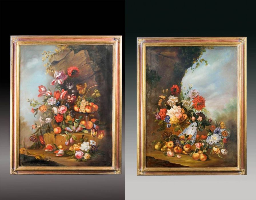 L’autore di questi due bellissimi quadri rende realista al massimo la frutta e i fiori che dipinge posando le sue “nature morte” su delle rocce rendendo il tutto di grande effetto scenico.
