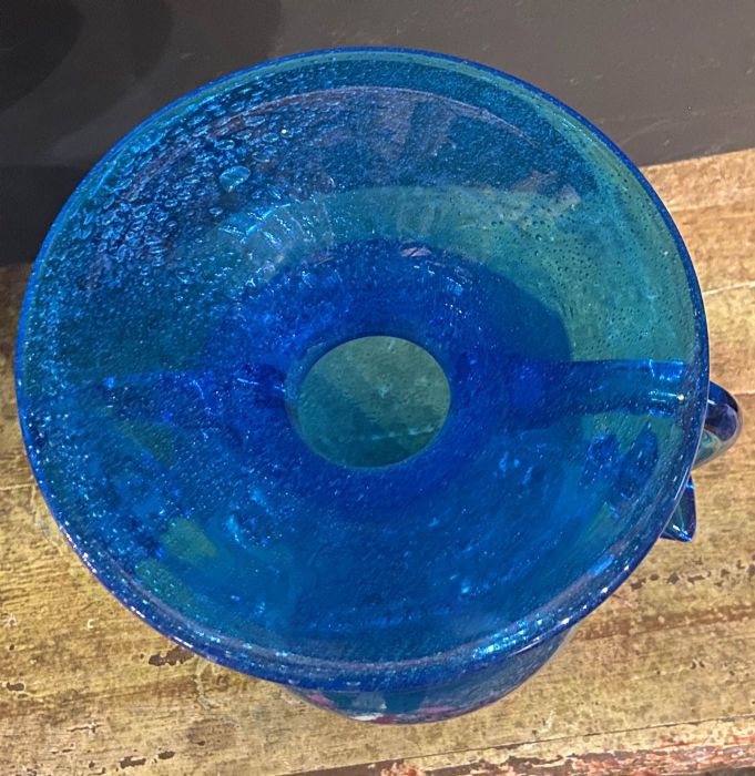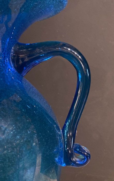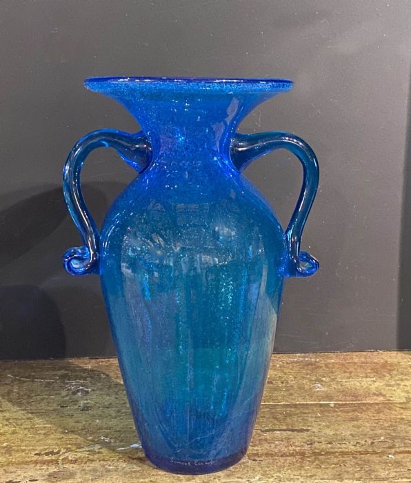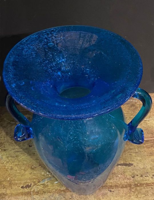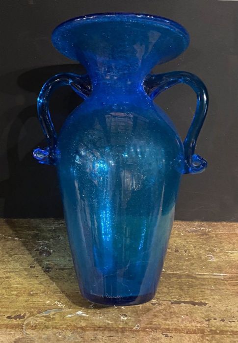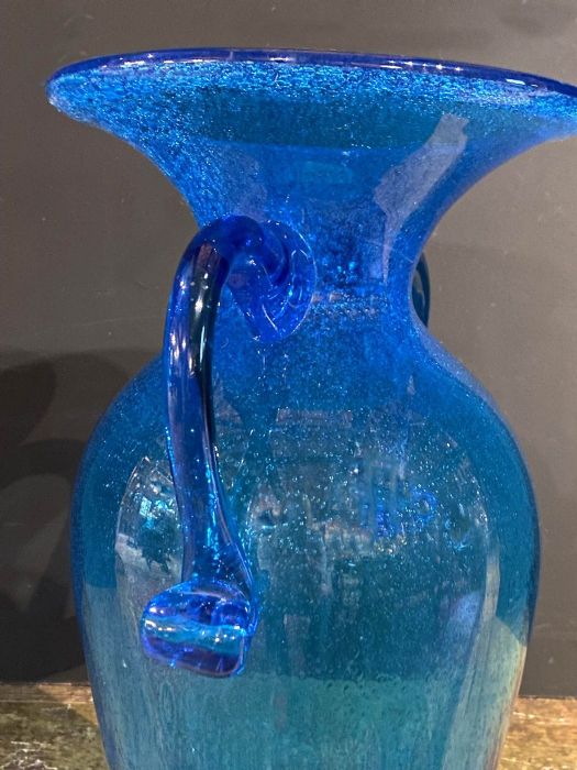 Elegante, raffinato classico vaso a forma di antica anfora nel colore blu cobalto con lavorazione a " vetro pulegoso".