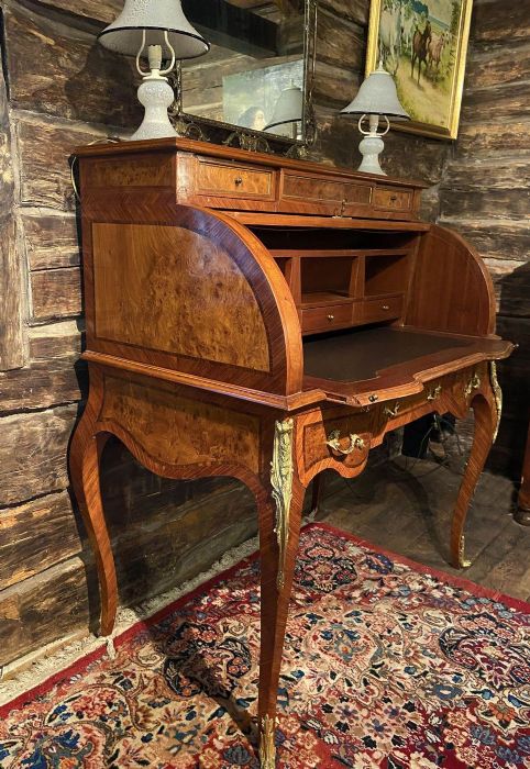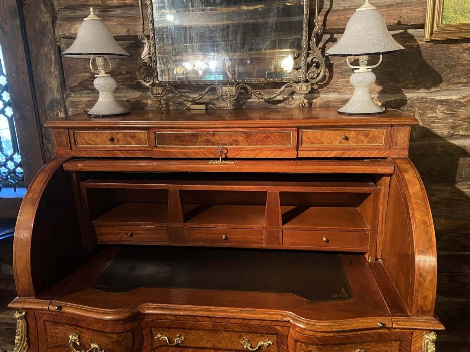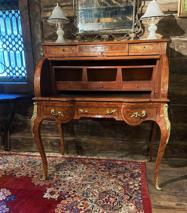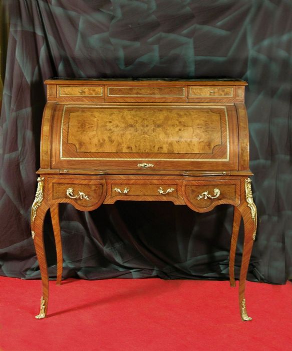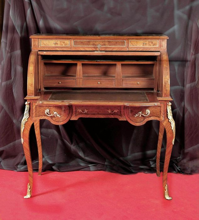 Elegante scrittoio da centro in cui una calatoia di forma semicircolare scorrevole (rullo) cela un piano estraibile con una parte in cuoio con decorazioni incise dorate che funge da scrittoio, un’alzata con la parte superiore porta documenti, tre vani e tre cassettini per riporre carte e piccoli oggetti.