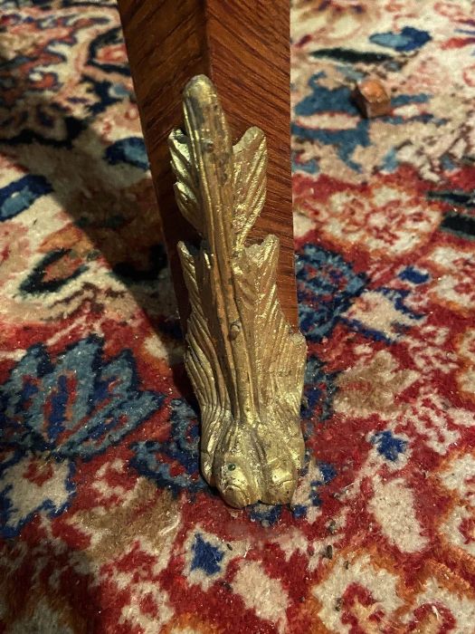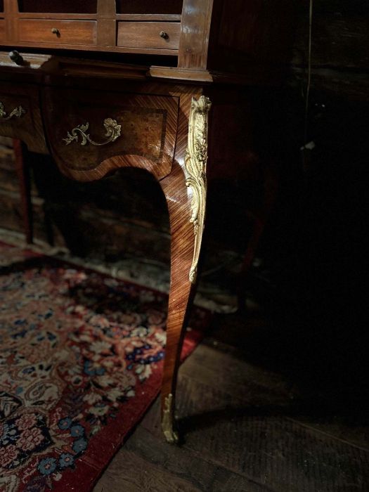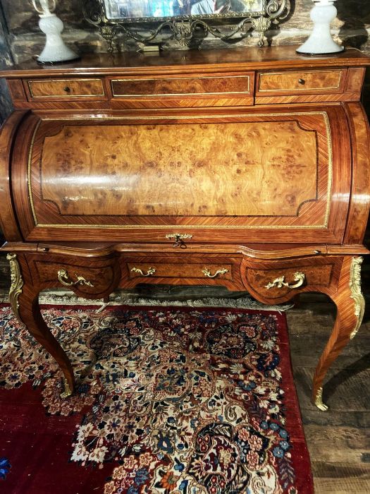 Lo scrittoio è in radica di noce e radica di olmo con diverse applicazioni in bronzo dorato, rifinito in ogni dettaglio.