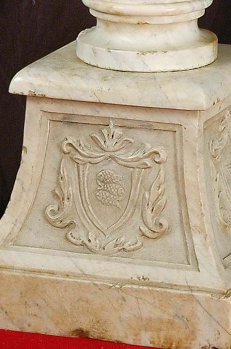 Eccezionale acquasantiera in marmo di Carrara. Di chiara impronta neo-classica. Grande eleganza e raffinata esecuzione. Sul basamento segni e simbili cristiani. Questo eccezionale manufatto marmoreo era posizionato in un'antica cappella privata.