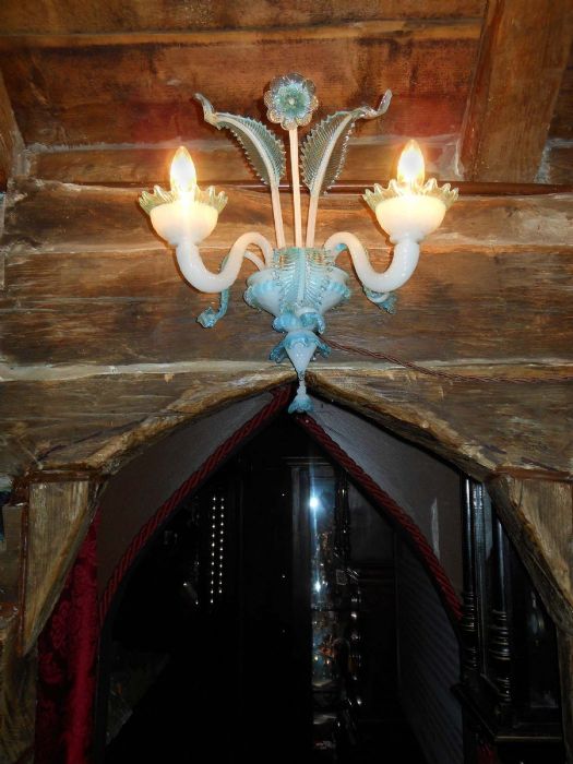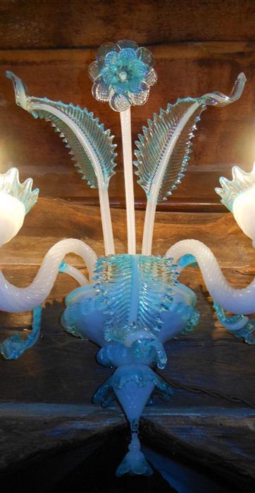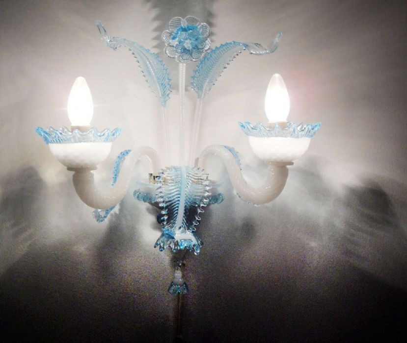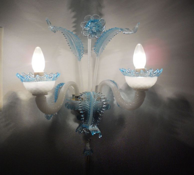 Questa applique può essere abbinata al bel lampadario “ELEGANTE LAMPADARIO DI MURANO OPALINO E AZZURRO A SEI LUCI”