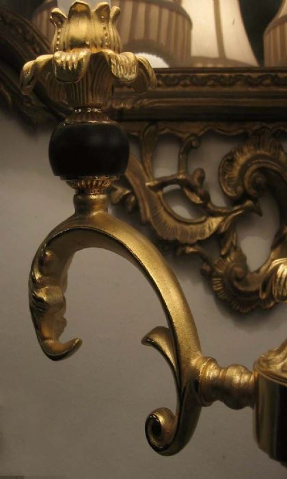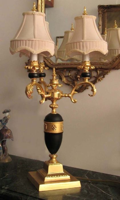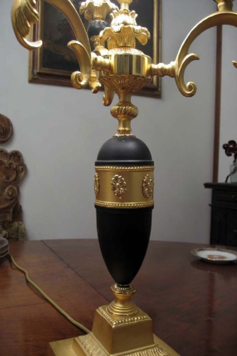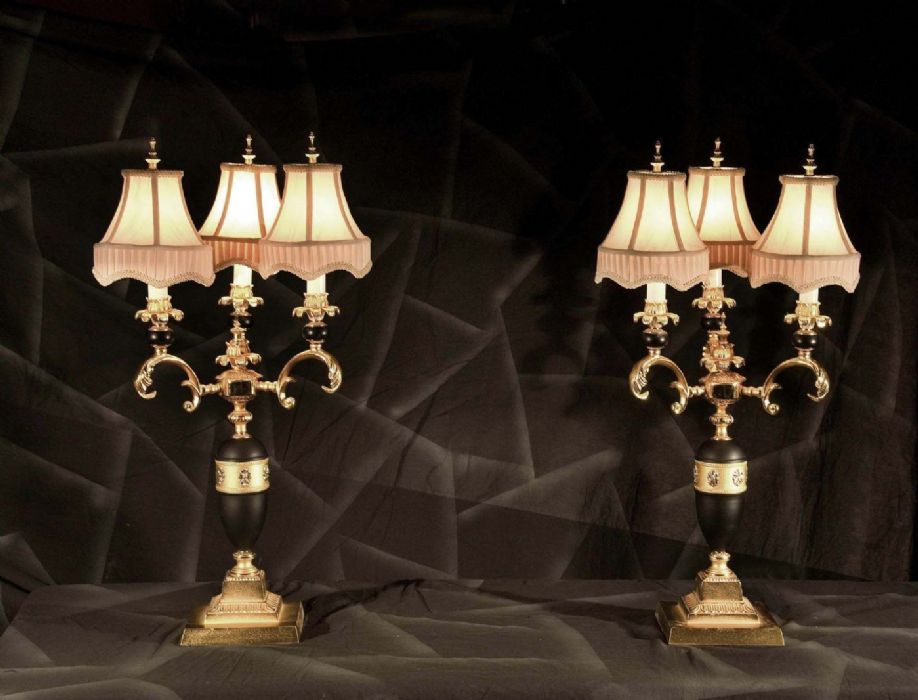 Belle ed eleganti coppie di lampade da tavolo stile Impero in bronzo dorato al mercurio e metalli vari, a 3 luci con ventole e pinnacoli.