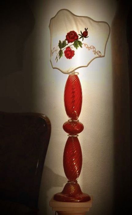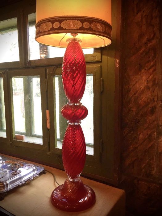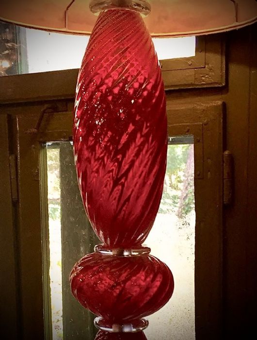 Piantana da appoggio con forme ad "oliva", lavorazione a torchon (omeglio rigamenà/ rigadin ritorto), in vetro rosso Venezia.