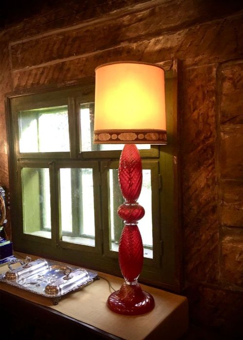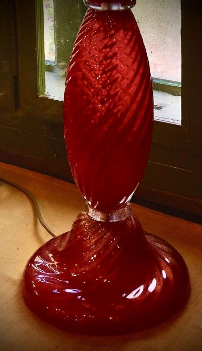 Piantana da appoggio con forme ad "oliva", lavorazione a torchon ( o meglio rigamenà/ rigadin ritorto), in vetro rosso Venezia.