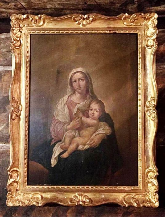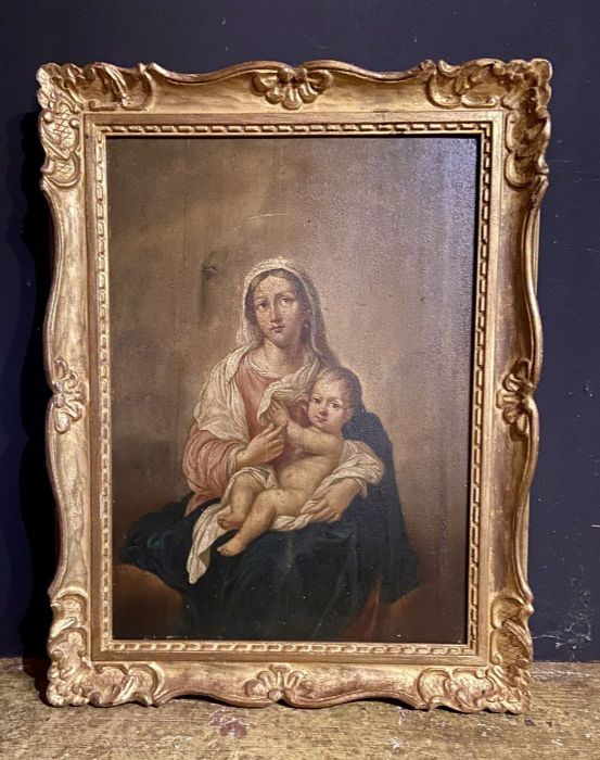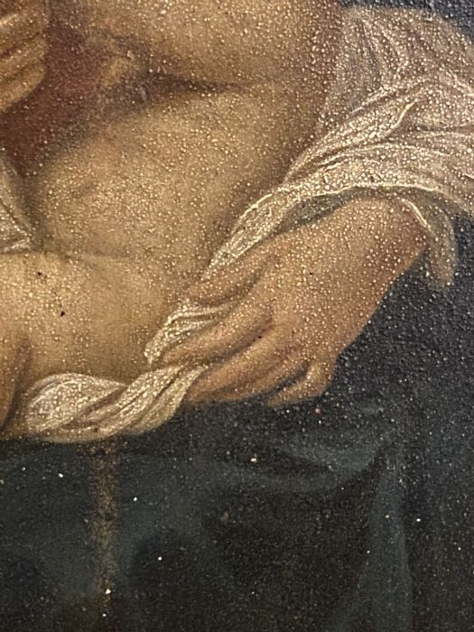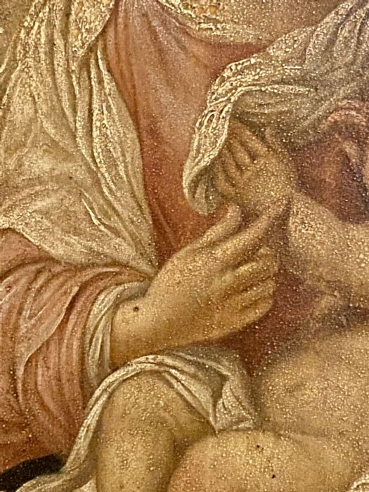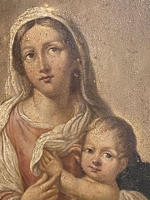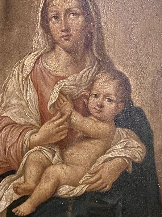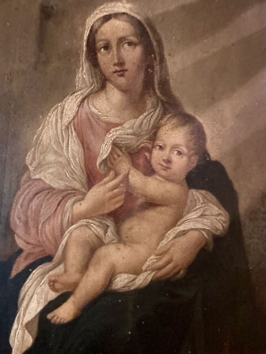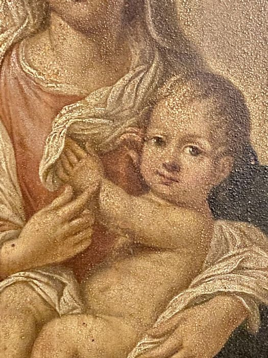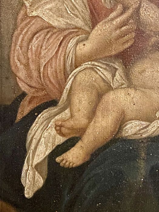 Di anonimo pittore con molta padronanza nel dipingere dal vero i bambini e le donne che rendeva poi Madonna e Santo Bambino nei suoi quadri. Molto belli i particolari, le mani dei due personaggi. La Madonna, che con la destra sfiora la piccola mano sinistra del Bambino che si appoggia alla veste della madre. Armonioso il corpo del Bambinello con gambe e piedini ben dipinti. I panneggi della veste della Vergine e il velo che scende sulle sue ginocchia a coprire un po’ il figlio.