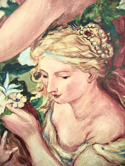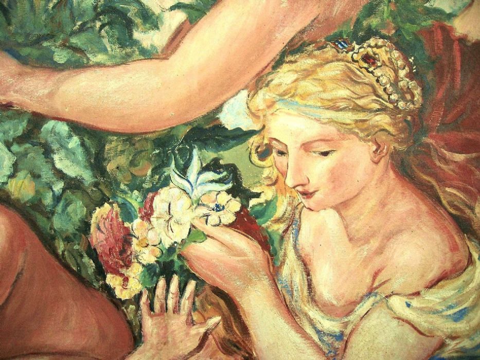 Il maestro Alberto Sanvitale (Roma 1927 - Sanremo 1999), allievo e seguace di Carlo Carrà, si trasferì nel 1966 sulla Riviera Ligure. Il suo colorismo pittorico e la grande forza decorativa delle sue opere trae origine da un'ispirazione genuina che lo fece indicare come il Matisse italiano. Questo primo di due grandi pannelli a tempera riportati su lastra di masonite facevano parte dei soffitti dipinti del Casinò di Sanremo.