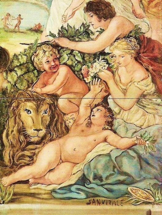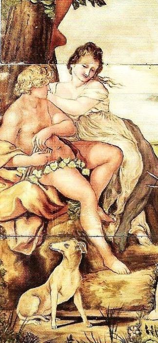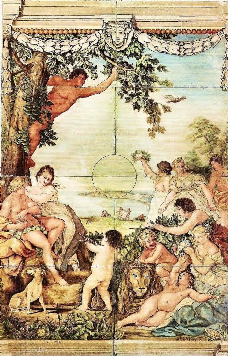 A destra notiamo un gruppo di ragazzi che,insieme a graziosi putti che giocano e si divertono tra loro in compagnia di un tranquillo leone. Mentre due giovani amoreggiano sotto ad un albero con ai loro piedi un bel levriere. che figure si riposa divertito e sereno. Intanto un ragazzo si arrampica sulla quercia per staccarne e gettarne a terra dei rami e uno dei puttini ne raccoglie per offrirlo ai due giovani. Dietro a questa scena vediamo in lontananza altri ragazzi che danzano tenendosi per mano.
