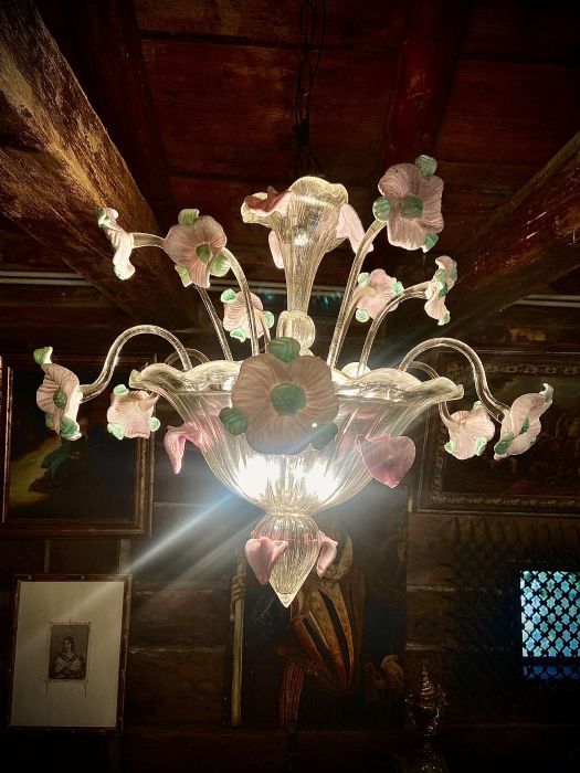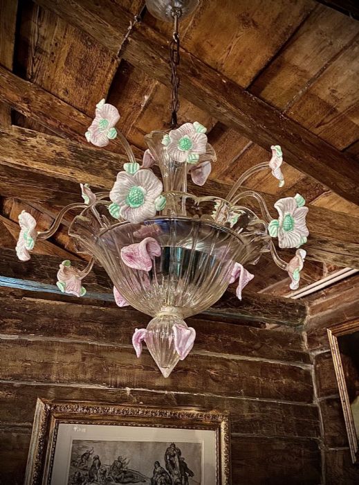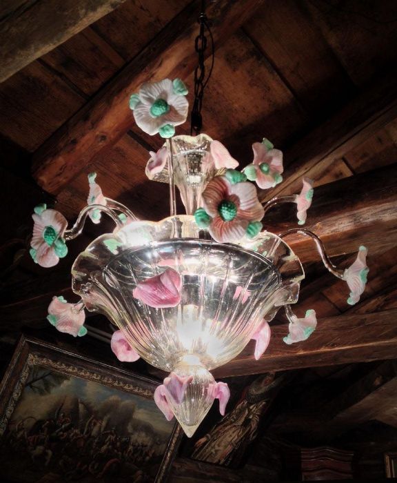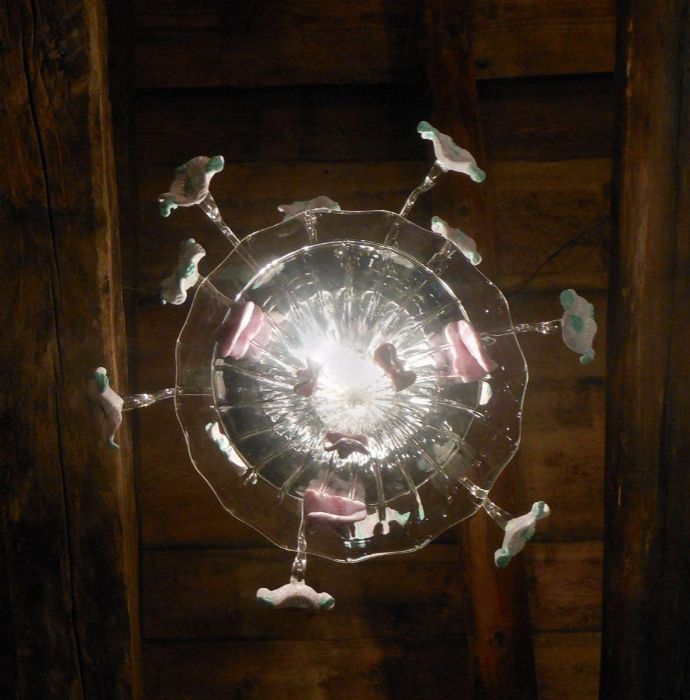 Alcuni petali rosa sono “volati via dal mazzo” e si sono posati (applicati a caldo) nella parte alta del “fuso”, ai lati della “fondina” e sul “finalino” del lampadario!!