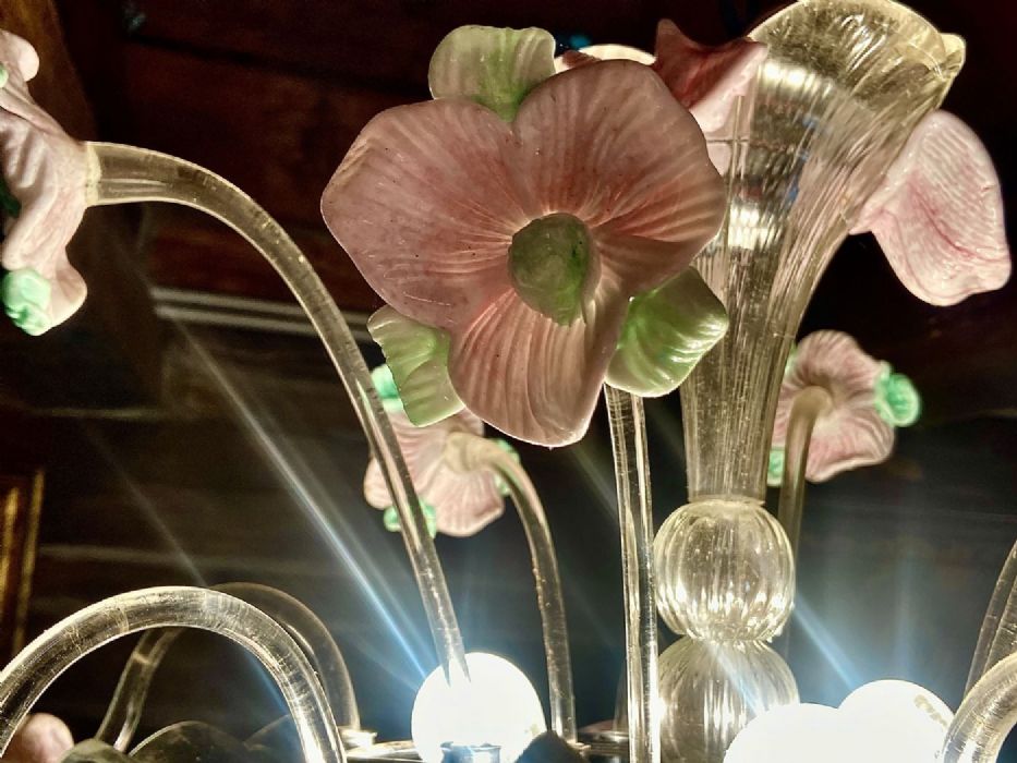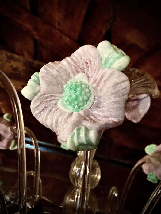 Fiori in pasta di vetro rosa tenue e verde pastello (che vogliono ricordare la ceramica) disposti in modo sfalsato come un mazzo di fiori in un vaso.