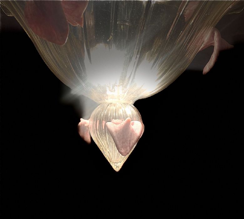 Lampadario - Plafoniera realizzato in vetro trasparente e con una elegante “fondina” che termina con un particolare movimento ad onda.