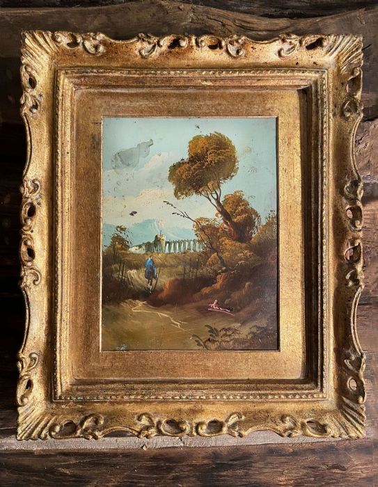 Nel primo quadro viene dipinto un paesaggio autunnale di campagna con sullo sfondo, in lontananza, una montagna innevata, in secondo piano una costruzione che può ricordare una torre e un ponte a più campate. Quasi in primo piano vi è una figura stilizzata di uomo, avvolto in un pastrano azzurro con ai piedi un paio di stivali imbottiti. La bellezza di questo quadro è la meticolosità con cui il pittore realizza in punta di pennello la chioma autunnale dell’albero posto sulla destra del dipinto e del cespuglio sottostante, con i colori e la luce del momento.