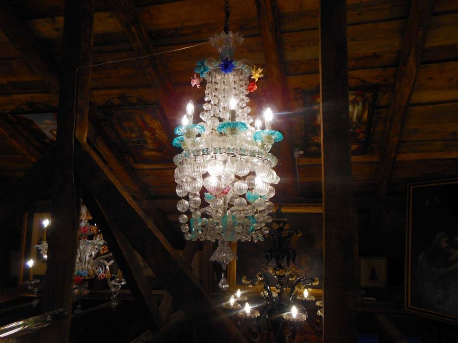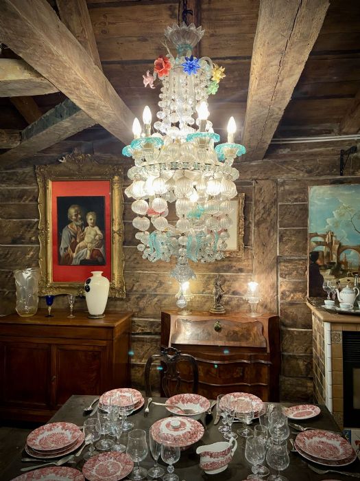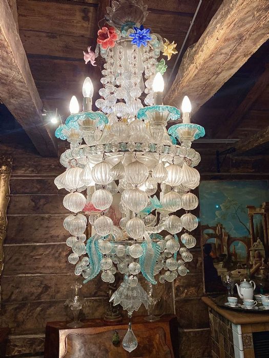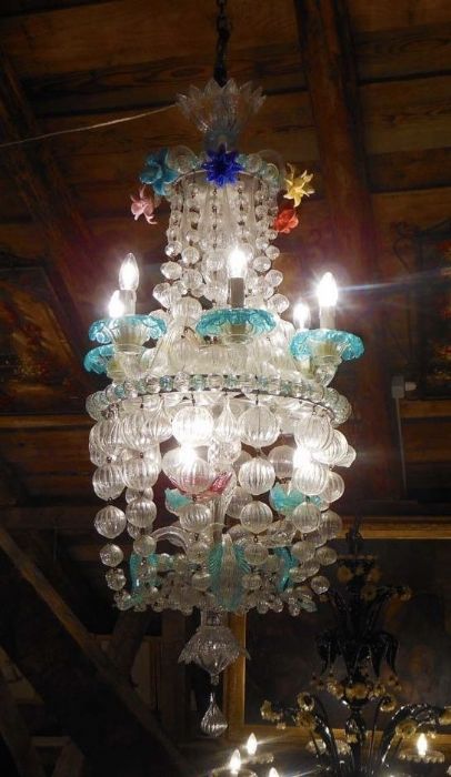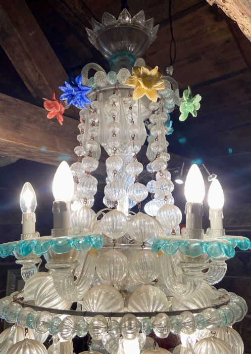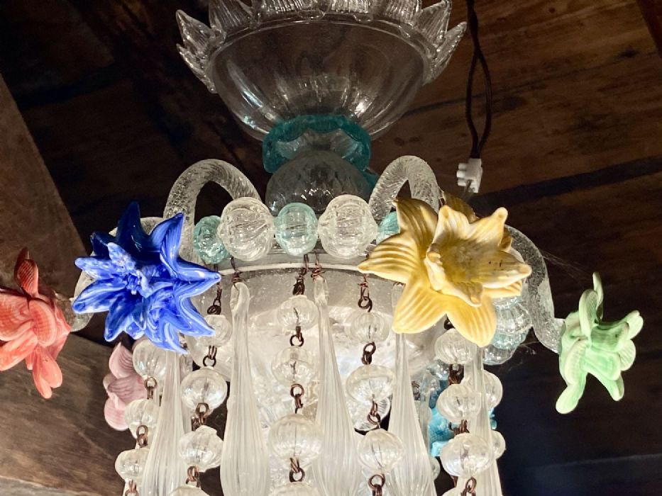 Nella sua parte superiore troviamo sei bracci che si alternano a fiori in pasta vitrea con policromie di indubbia suggestione.