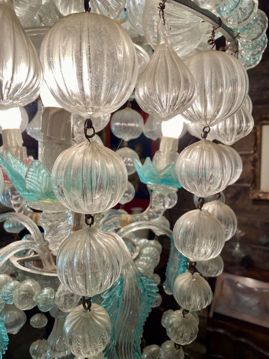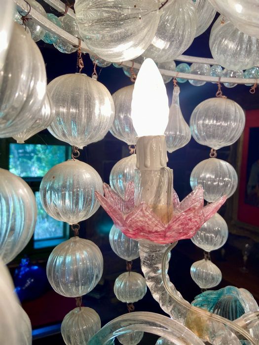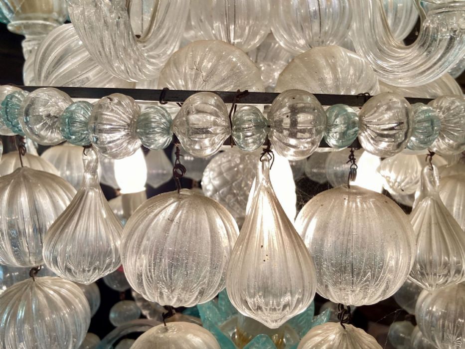 In particolare questo lampadario “mirabilia” ha le sfere soffiate e tirate a pinza a grandezza decrescente verso il basso.