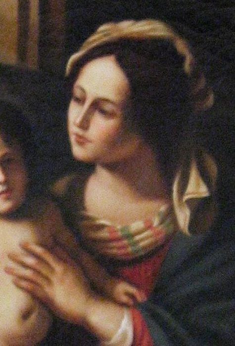 Madonna col Bambino benedicente - copia antica dall'originale del Guercino del 1629, entro cornice lignea dorata. La Madonna presenta un'insolita acconciatura " alla romana " con un fazzoletto al collo dai vivacissimi colori.