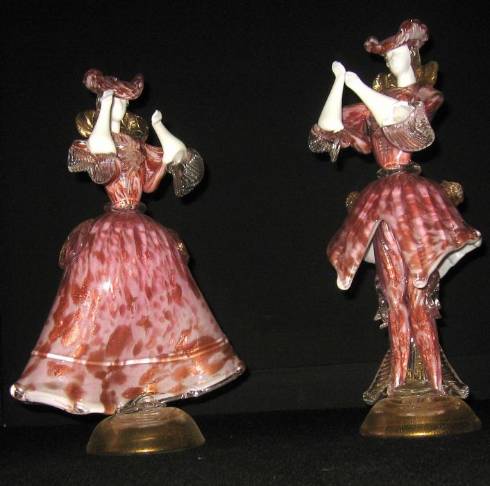 Elegnte coppia di Goldoniane in vetro di Murano rosa e ametista, lattimo e applicazioni con oro colloidale in mestica. Soffiate e tirate a pinza. Di particolare abilità da parte del maestro il movimento della danza data alle due figure sia maschile che femminile.