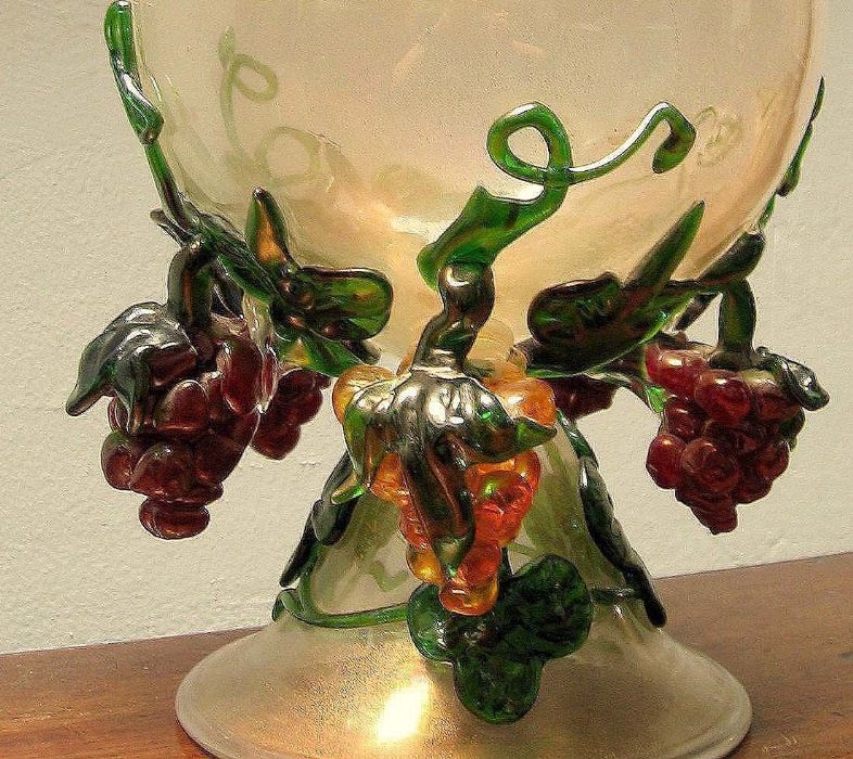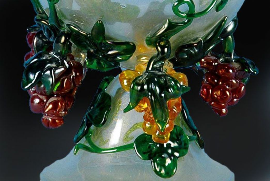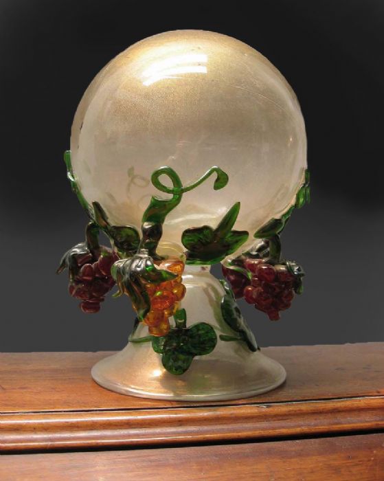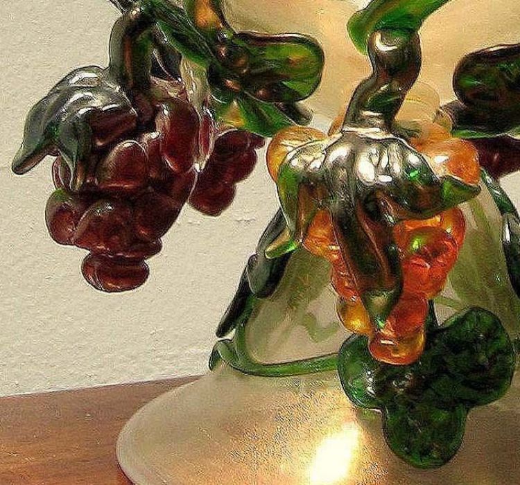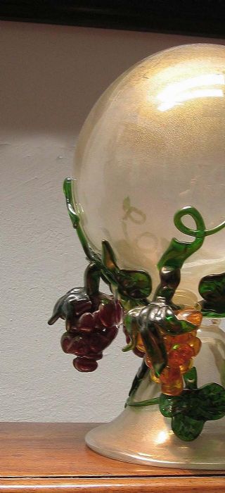 Scultura in vetro soffiato e oro in intrusione con belle policromie nei grappoli e tralci di vite.