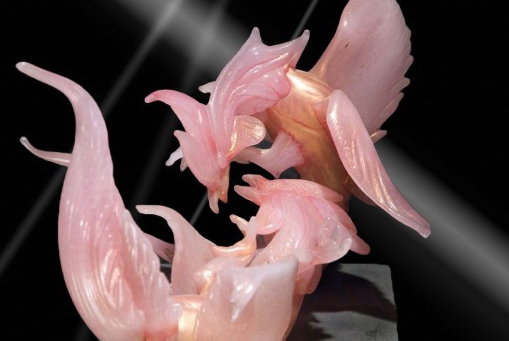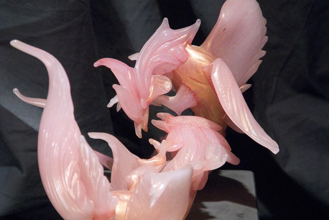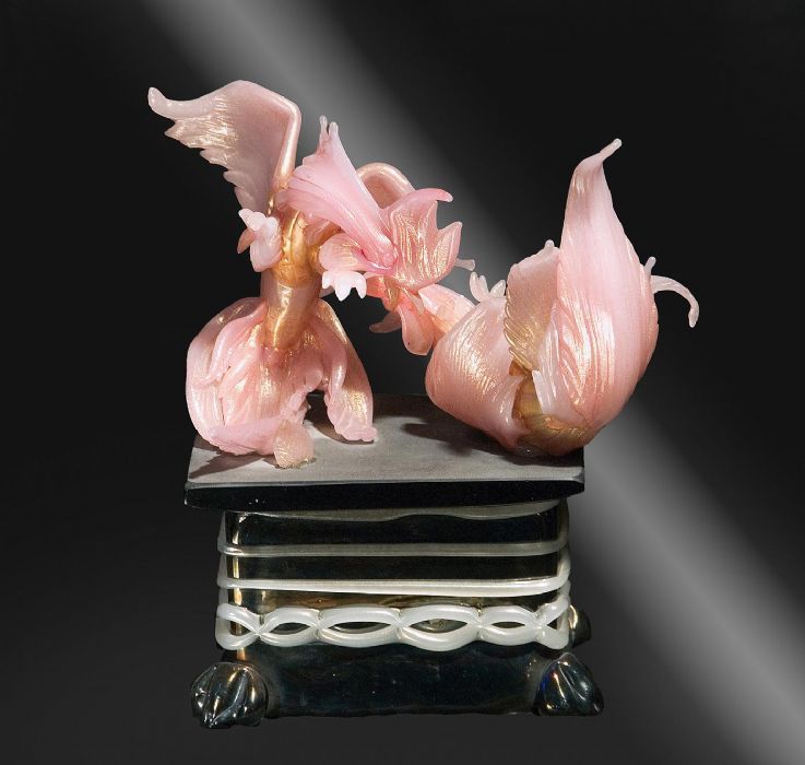 Straordinaria scultura dinamica in pasta di vetro con corallo rosa, oro ,con galli tirati a pinza, di straordinaria plasticità, piedistallo iridescente.