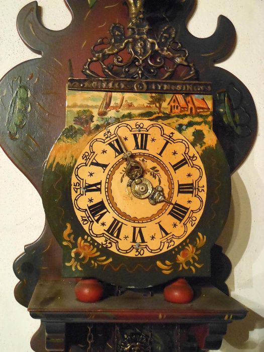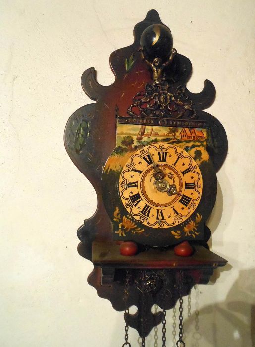 Questo orologio a sgabello "FRIESIAN STOELKLOK ", particolare per il suo aspetto, è riccamente dipinto con scene agresti e di mare che ricordano appunto l'Olanda.