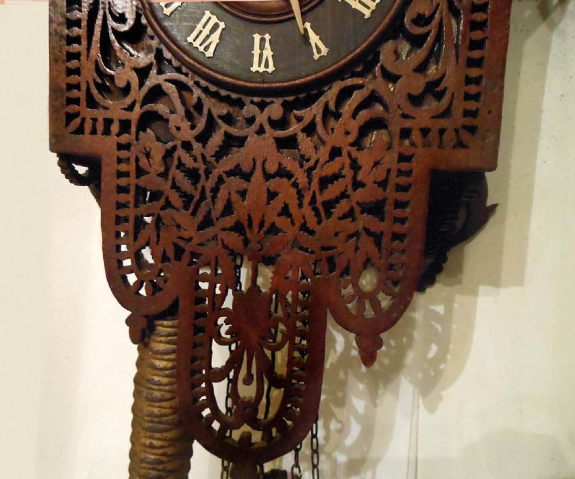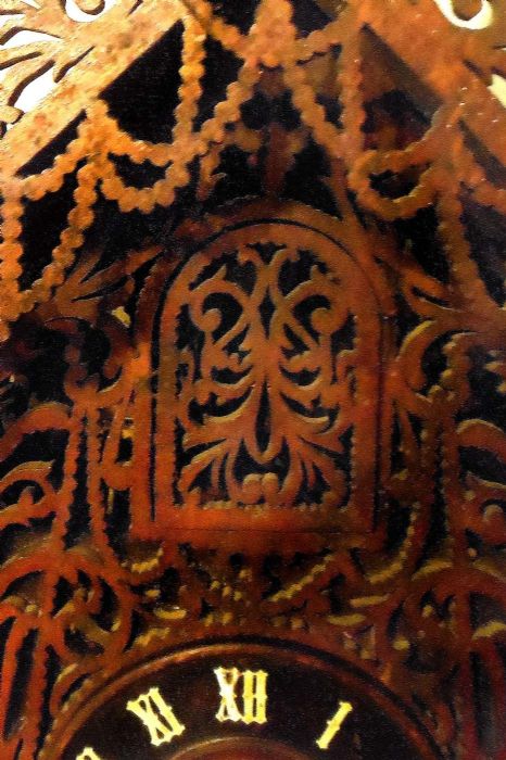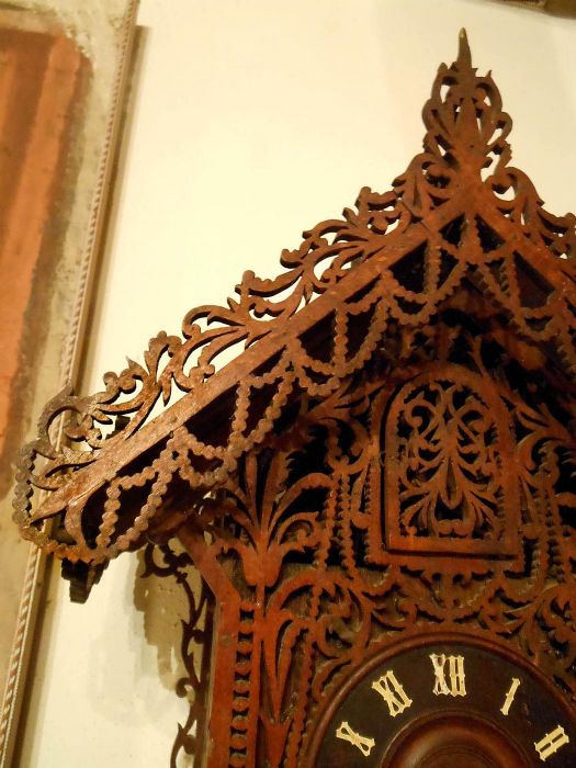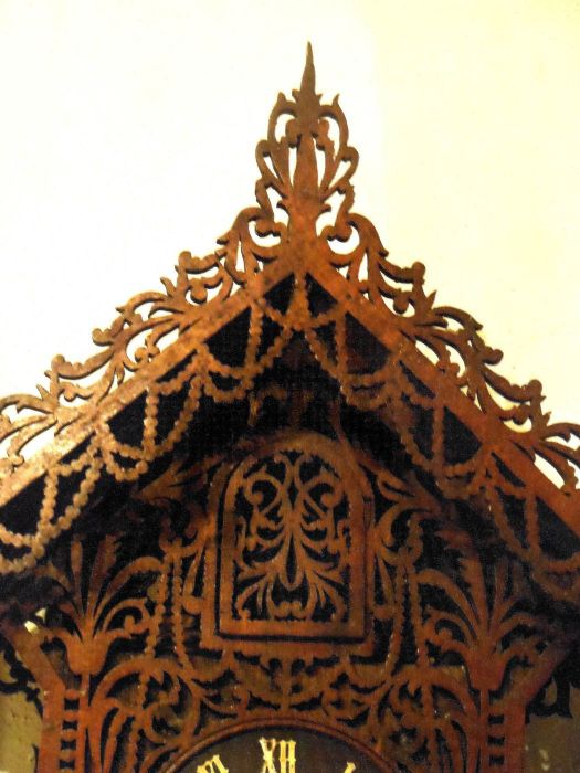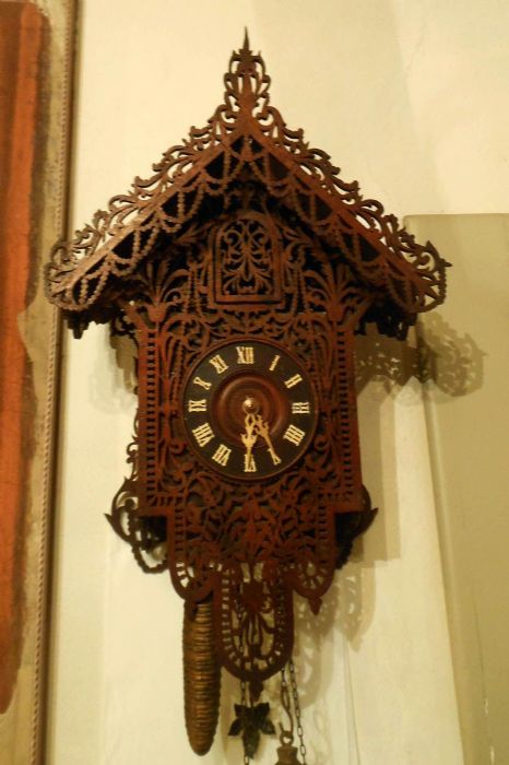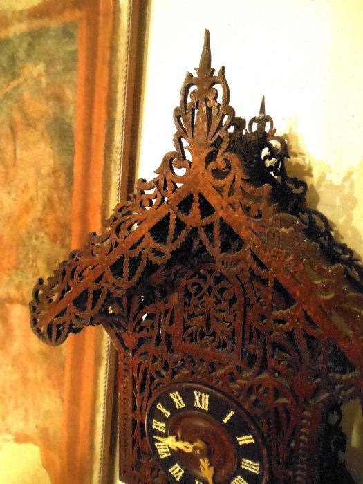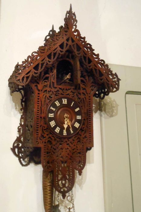 A partire dal primo quarto del XVIII sec. si cominciano a produrre, nella tipologia a noi più familiare, i famosi orologi a cucù. Generalmente le casse, in legno di pino o abete intagliato, sono a forma di casetta con tetto a doppia falda e sportello nella parte superiore del quadrante dal quale fuoriesce l'uccellino che, nei migliori esemplari, ha becco e ali mobili. Le catene e i pesi forniscono il movimento, il suono è ottenuto tramite due soffietti che producono il famoso "Cucù" e, a seguire, il rintocco del gong che segna l'ora e la mezz'ora. Alcune varianti sul tema consistono, come in questo caso, in modelli particolarmente raffinati. La cassa del cucù è stata intagliata con maestria nel legno di abete rosso determinando un effetto "a merletto" che fa diventare questo orologio UN ESEMPLARE UNICO E IRRIPETIBILE.