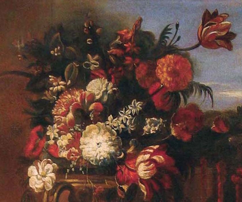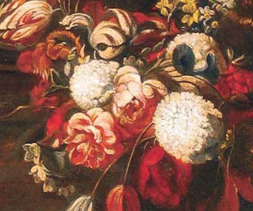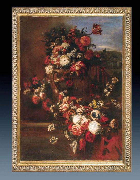 Gaspar Verbruggen, le jeune (1664-1730) (dai modi di). Bella interpretazione dei modelli fiamminghi e olandesi con particolare risalto ai colori dei fiori nel pieno del rigoglio primaverile. Interessante la disposizione sul terrazzo con sfondo di paesaggio e costruzioni in lontananza. olio su tela. Cornice d'arte.